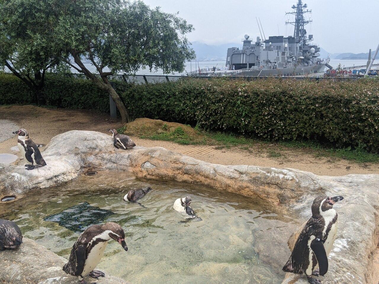 フンボルトペンギンです。向こうに海上自衛隊の船が見える。下関には基地があるのか。