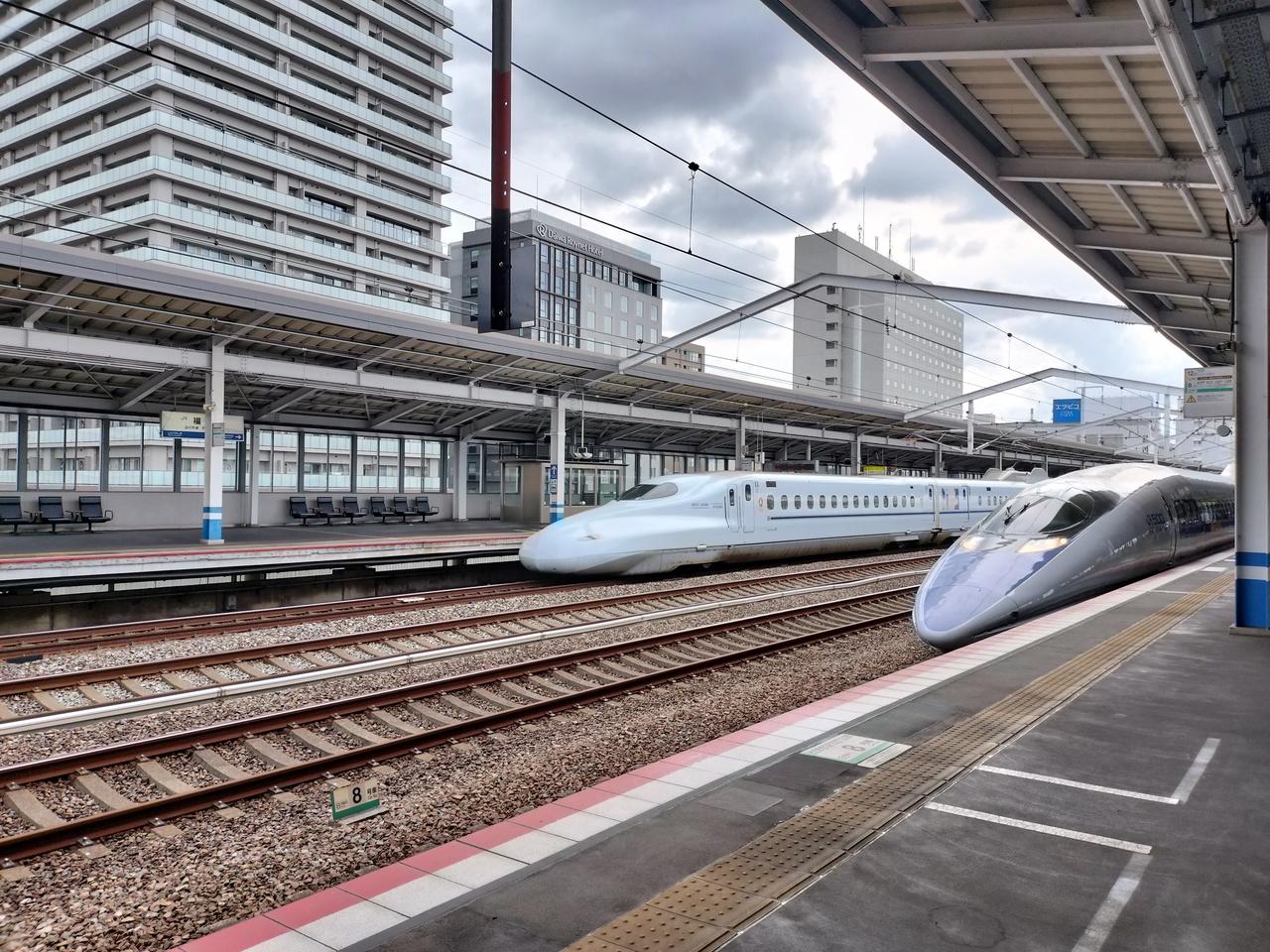 15分駅に立つ 間に 新幹線を3台も見た。みんなデザインが違う。あっという間に名古屋に到着。シートの足元が広くて、行きの車両には ウォシュレットもあってびっくりした。