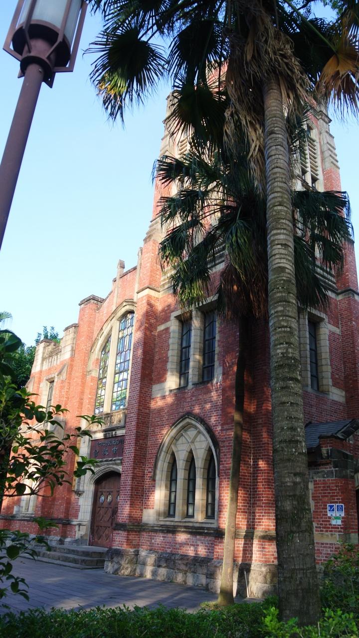 南国風の木々の緑に赤煉瓦が映えて美しい済南教会です。(台北基督長老教会済南教会)