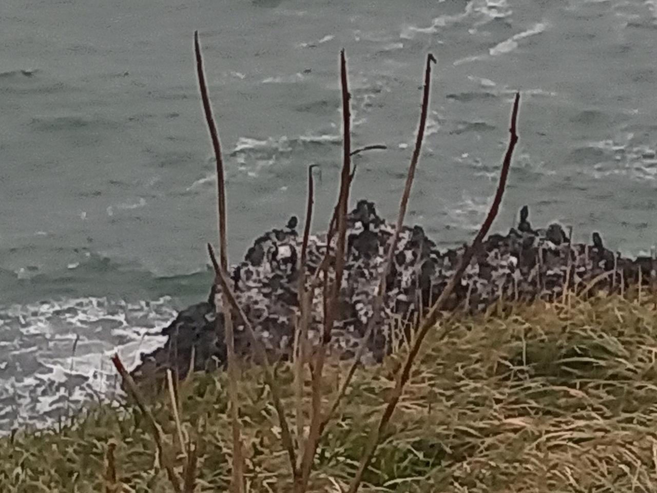 高倍ズームにすると、先端の岩に鳥が数羽小さく見えます。