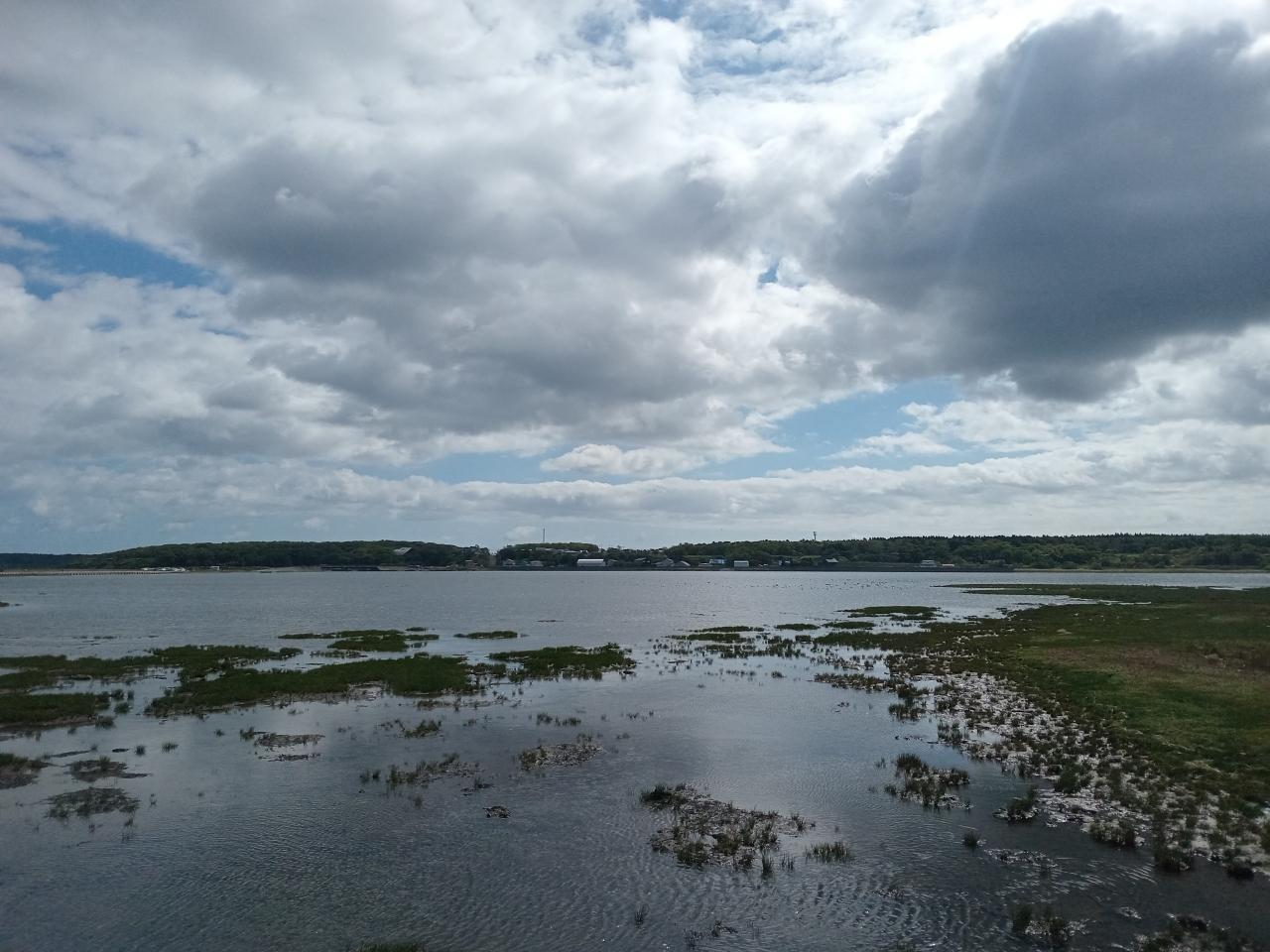 方向によって青空と雨雲が混合しています。明るい空の方は雄大で美しい海、沼ですね。
