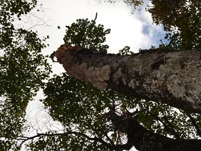 サルノコシカケのような大きなキノコが幹に連なっている