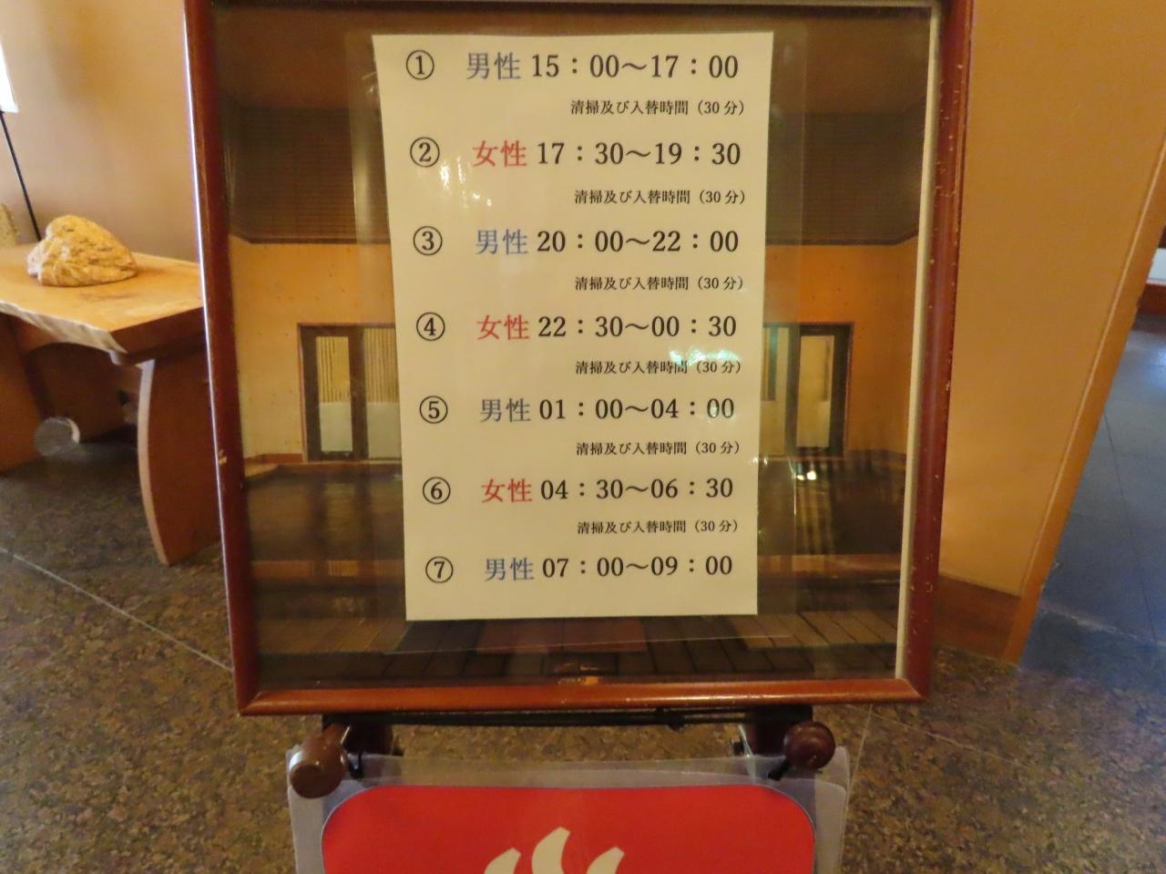 事前にホテルから自宅に電話があったのですが、風呂のひとつに不具合がでたらしく、ひとつの風呂を男女で交互に使用することにしているとのこと。