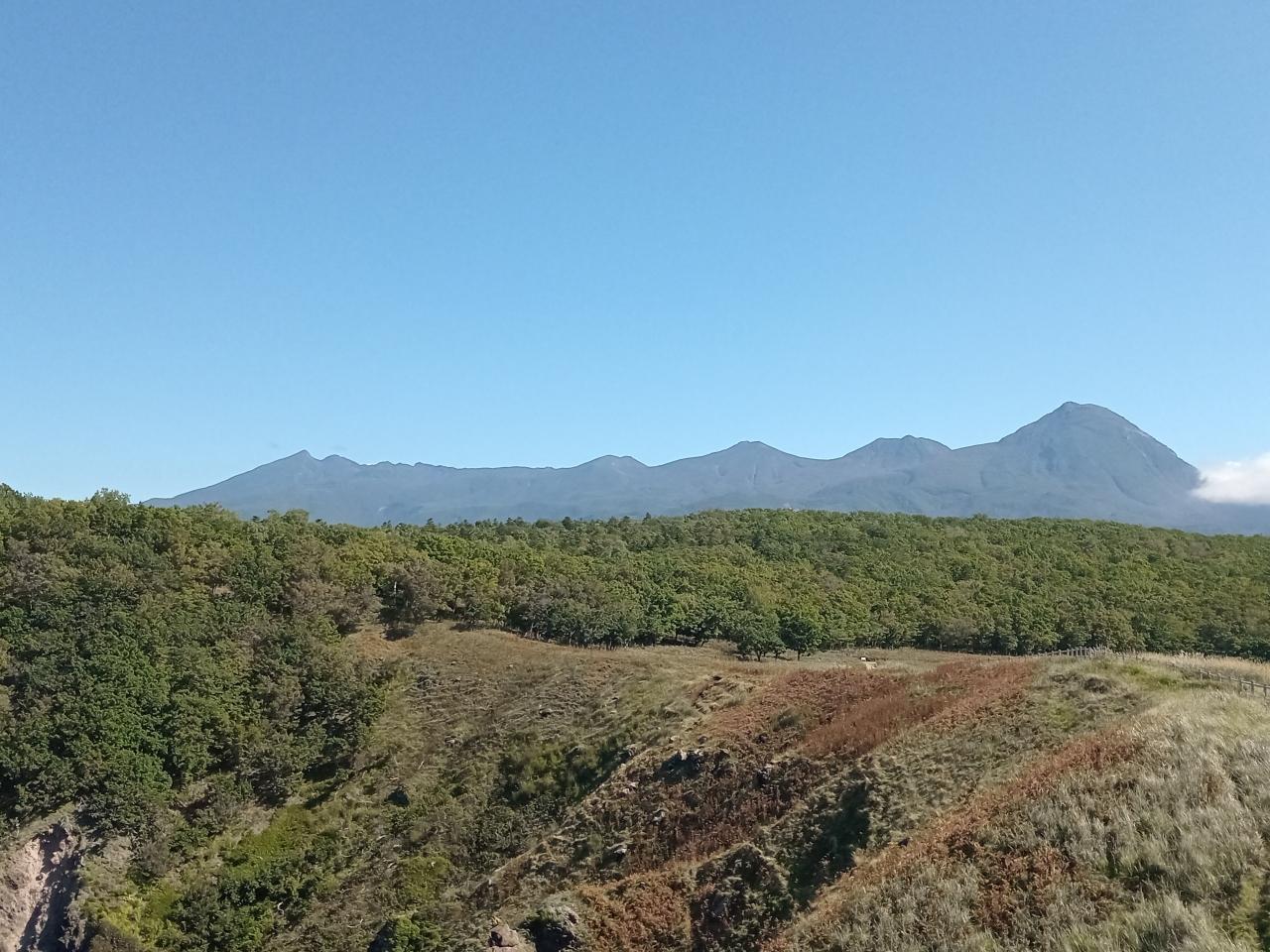右側のピークが見える大きな山は羅臼岳ですね。逆光が和らぐアングルで青空の下、美しく雄大です!