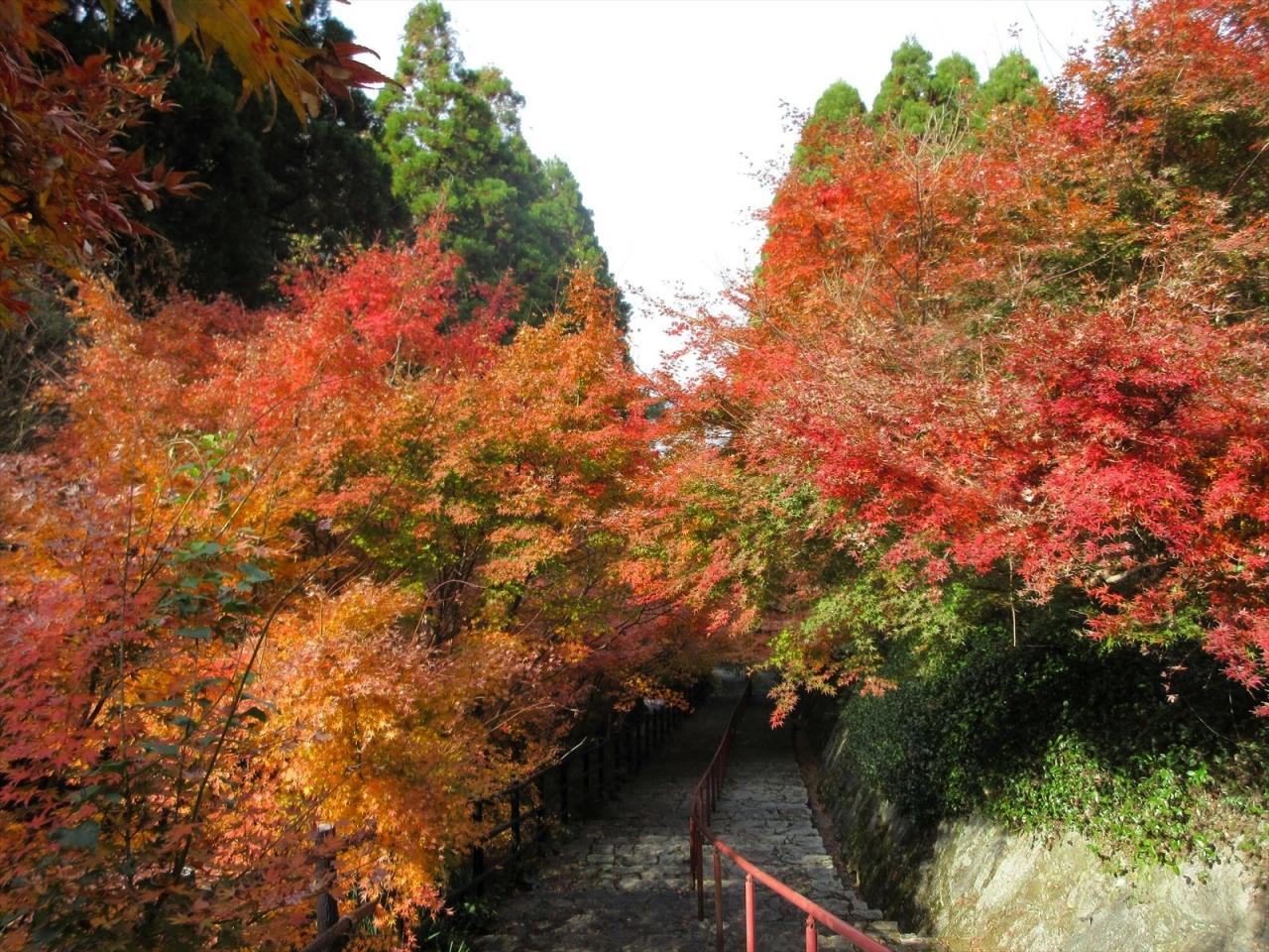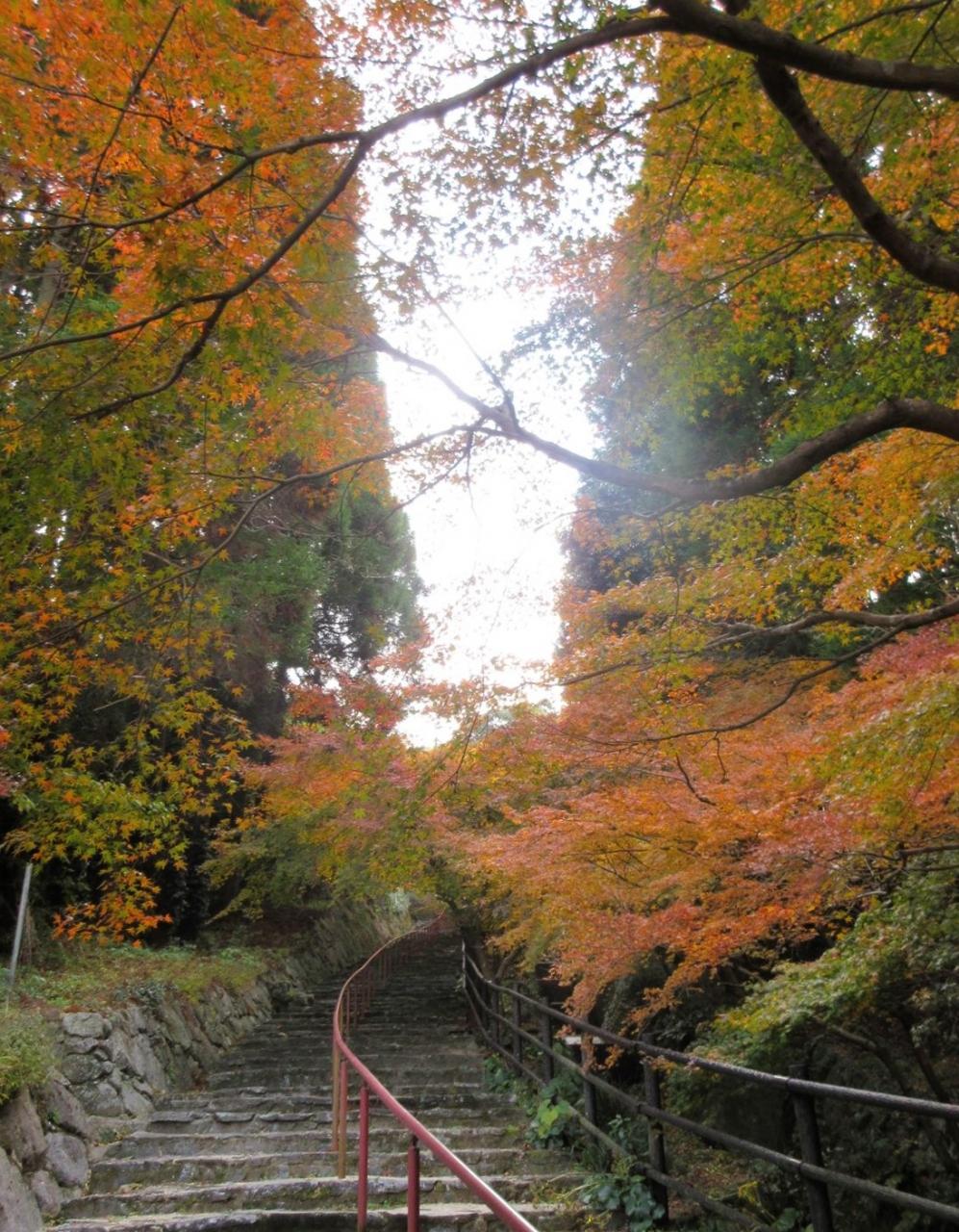 階段の上の方は明るくなり、葉も色づいています。