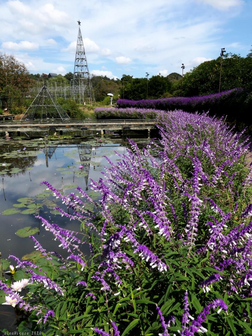 「フラワーステージ」の周囲の水路に咲く熱帯性スイレンと、満開になったアメジストセージと、後方にはイルミネーション・タワー、この時季だけの組み合わせです。
