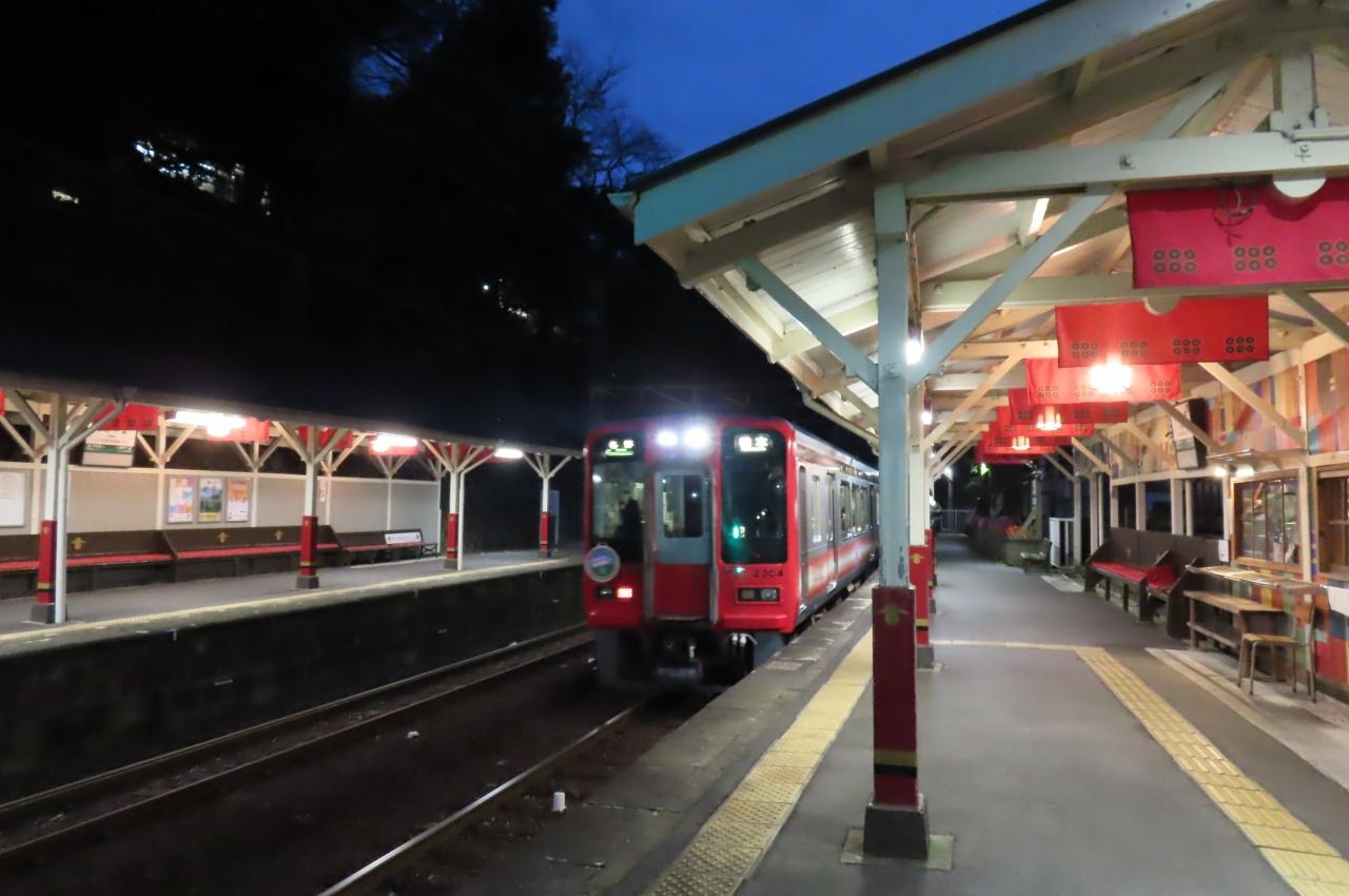 日が暮れると、益々雰囲気の良くなる駅です。地元の方も、何となく、赤い車買いたくなりますよね、駅が赤で決めてるから