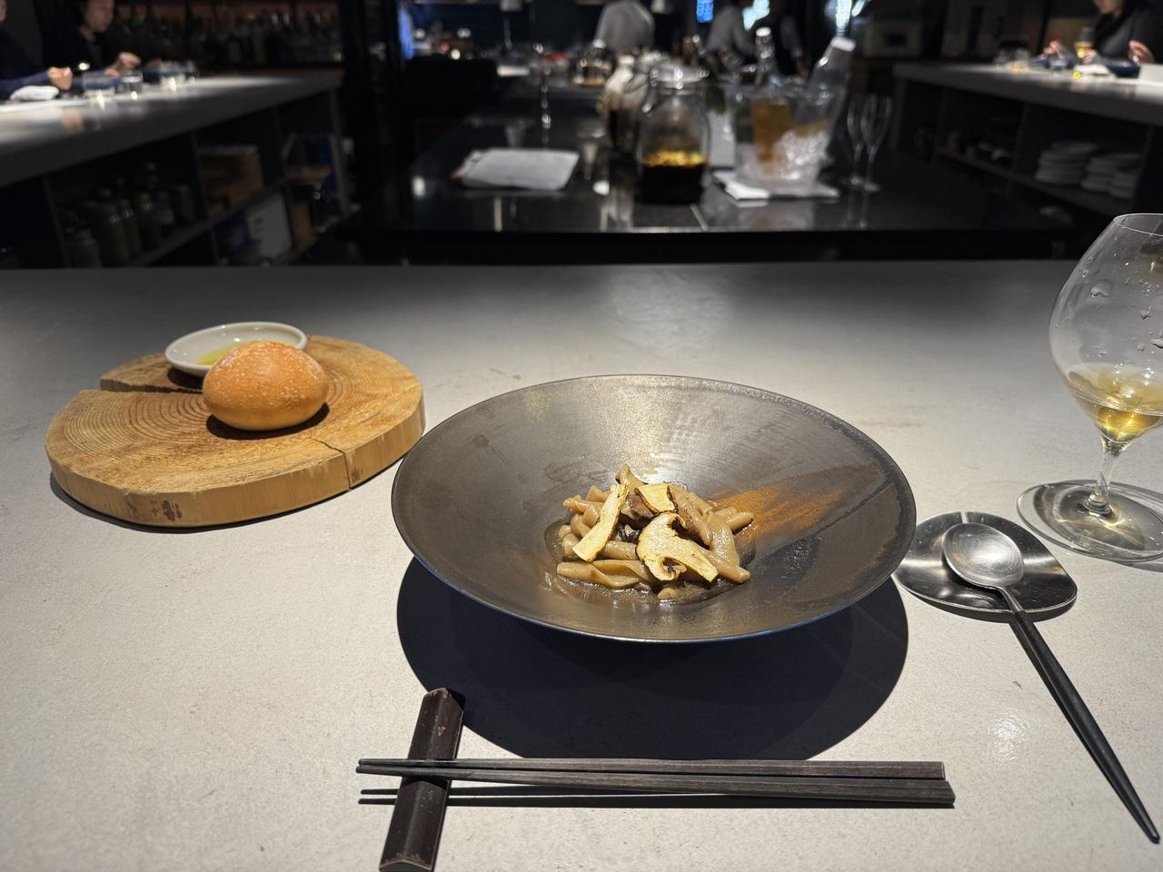 ウスバハギの炙り刺身。杉で燻製をかけた燻製オイルがかかっていて上品なお味。そして左に添えてある肝のペーストが、人生で食べた中で最高級に美味しかった…!!