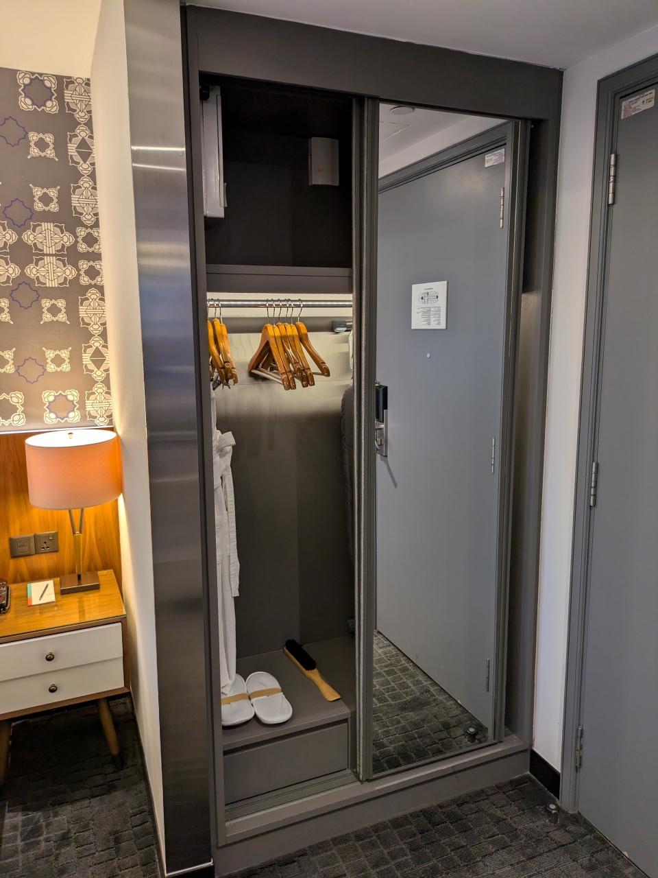 クローゼットにはスリッパ、ハンガー、バスローブ、アイロン台などが収納されていました。 -