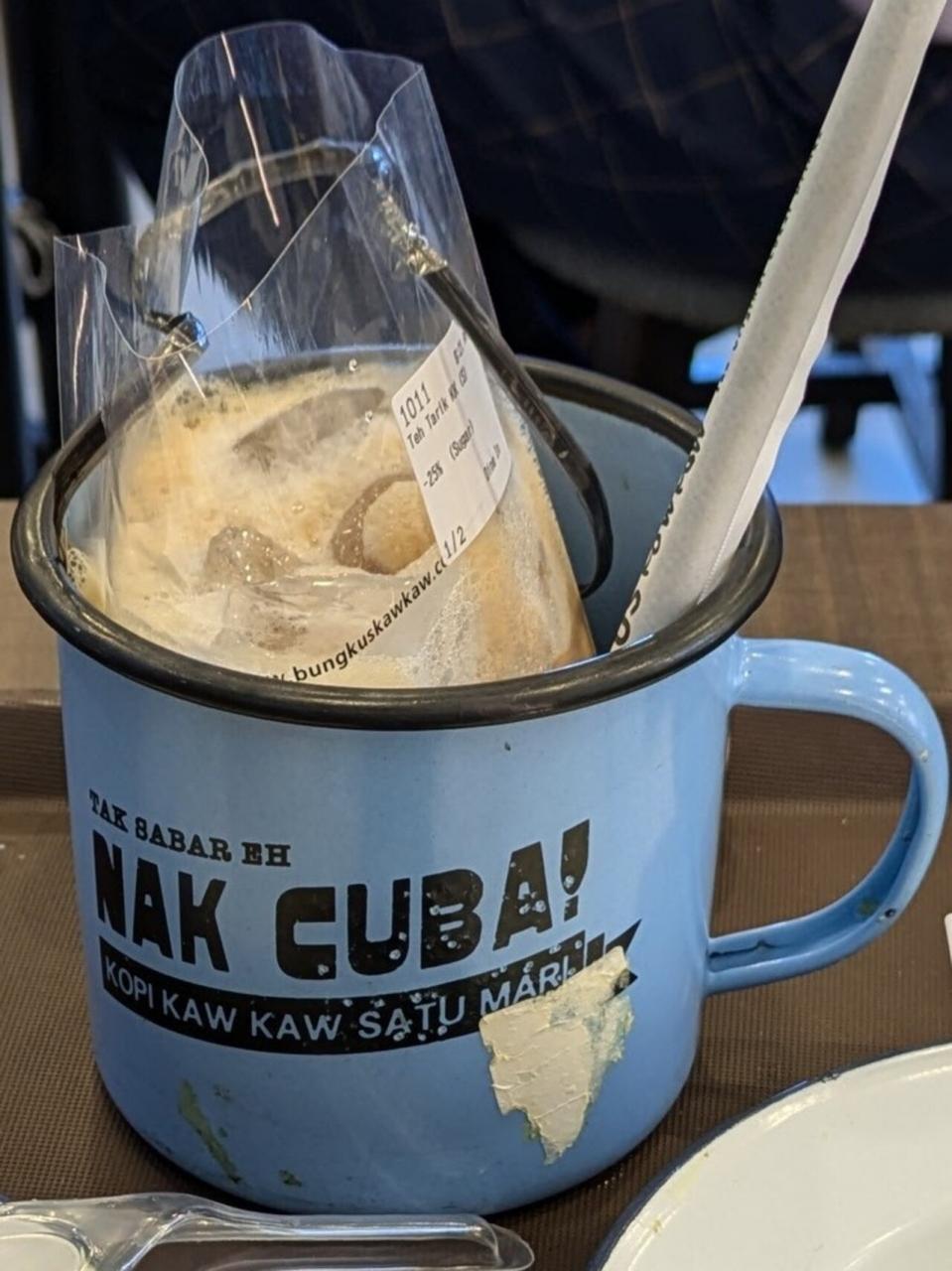 BUNGKUS Kaw KawのTeh Tarikは、なぜか手提げの付いたビニール袋に詰められ、ステンレススチール製のマグカップに入れられて提供されました。 -