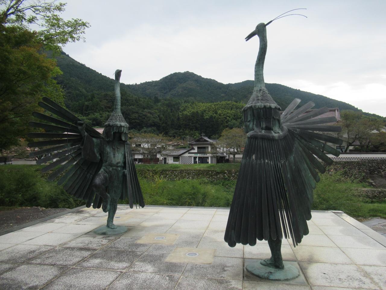津和野川に架かる津和野大橋のそばの広場に建っています。鷺舞は弥栄神社の神事として奉納される舞で、鷺の衣装を着たつがいの鷺舞役者が披露します。京都祇園から伝授された古典芸能で、国重要無形民俗文化財です。泊まった宿の女将さんが、鷺舞の衣装は重く舞うのが大変なこと、二人の役者が毎年舞っていることなどを教えてくれました。像を見ると力強い舞に感じられました。1994年に建立された像です。