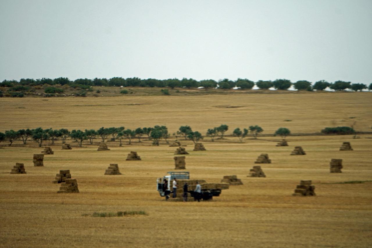 牧草地では刈り取った草を四角い束にまとめています。これはチュニジアではポピュラーな牧草の保存方法のようです。日本でポピュラーなロールベールラップサイロというビニールでラッピングする方法は見掛けませんでした。ロールベールの場合牧草は発酵することにより栄養価は変わらないようですが、家畜の嗜好性が関係するようです。