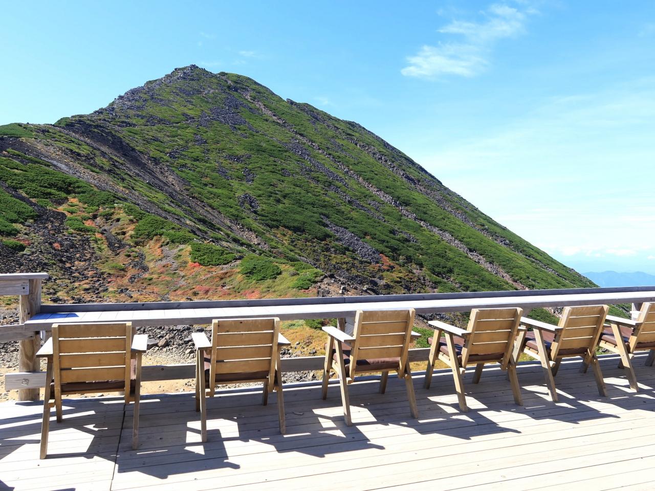 正面に摩利支天乗越を望むデッキのソファーや椅子に座ってくつろげるのも人気の要因だろう。