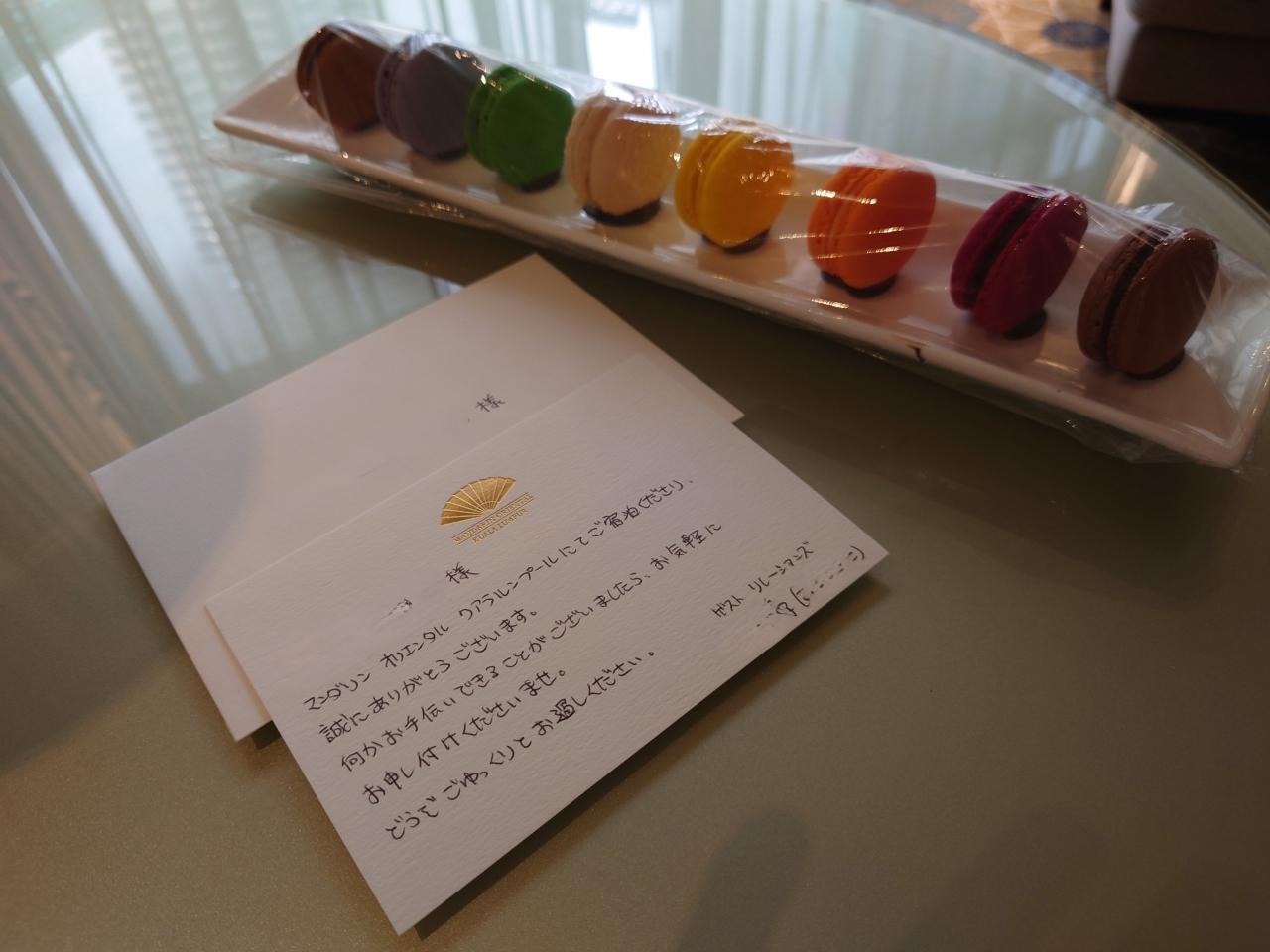 日本人の女性スタッフがカラフルなマカロンを持ってご挨拶に!