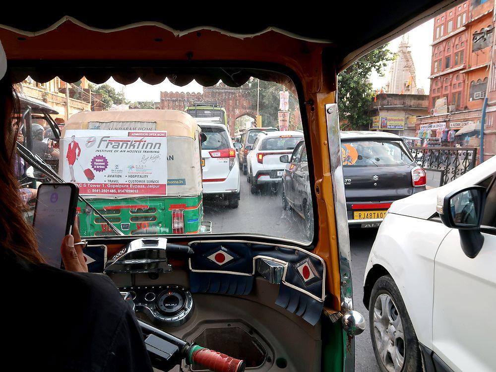 走りながら、迎えに来たツクツクのお兄さんが盛んに今日どこにいくのかと聞いてくるので、アンベール城と風の宮殿に地下鉄とバスで行くと答えると、地下鉄はやめておいた方がいいという。暑い上に、すごい喧騒の中、横断歩道もないような道を地下鉄の駅まで歩いて行くのもおっくうなので、お兄さんのツアーの誘いに乗ることに。料金は、最初一人1200ルピーだったが、行き先はアンベール城と風の宮殿だけでいいので、一人1000ルピー(1800円)で手を打った。ただ、後になって考えると、もう少し値切っても良かったかも(実際にはアンベール城に歩かずに楽して行くには追加料金がかかったため)。