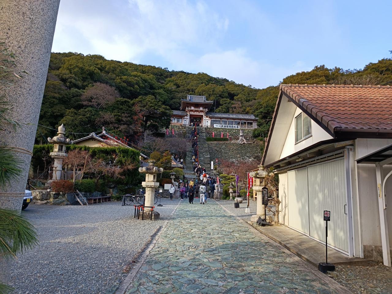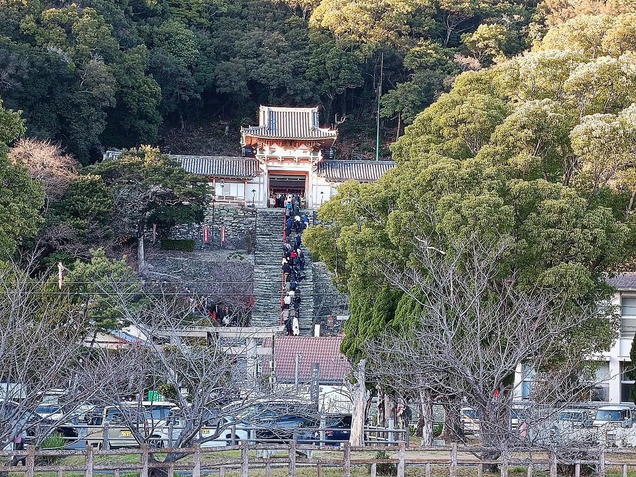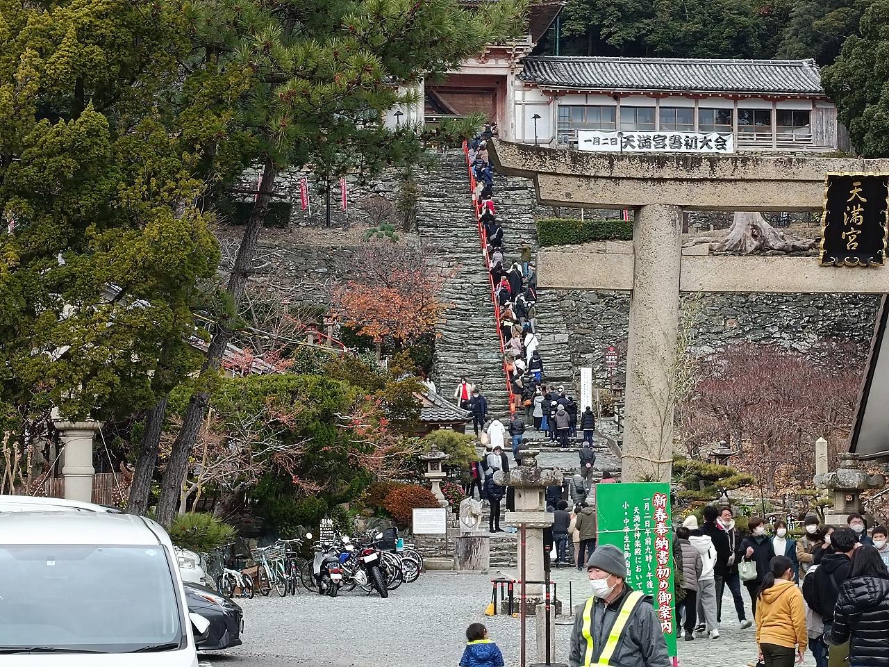 急な石段に並ぶ 初詣の客は 少な目 -