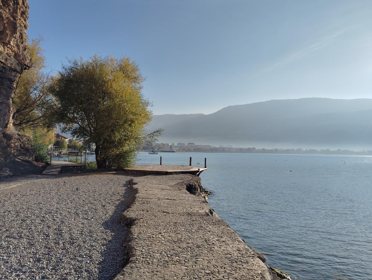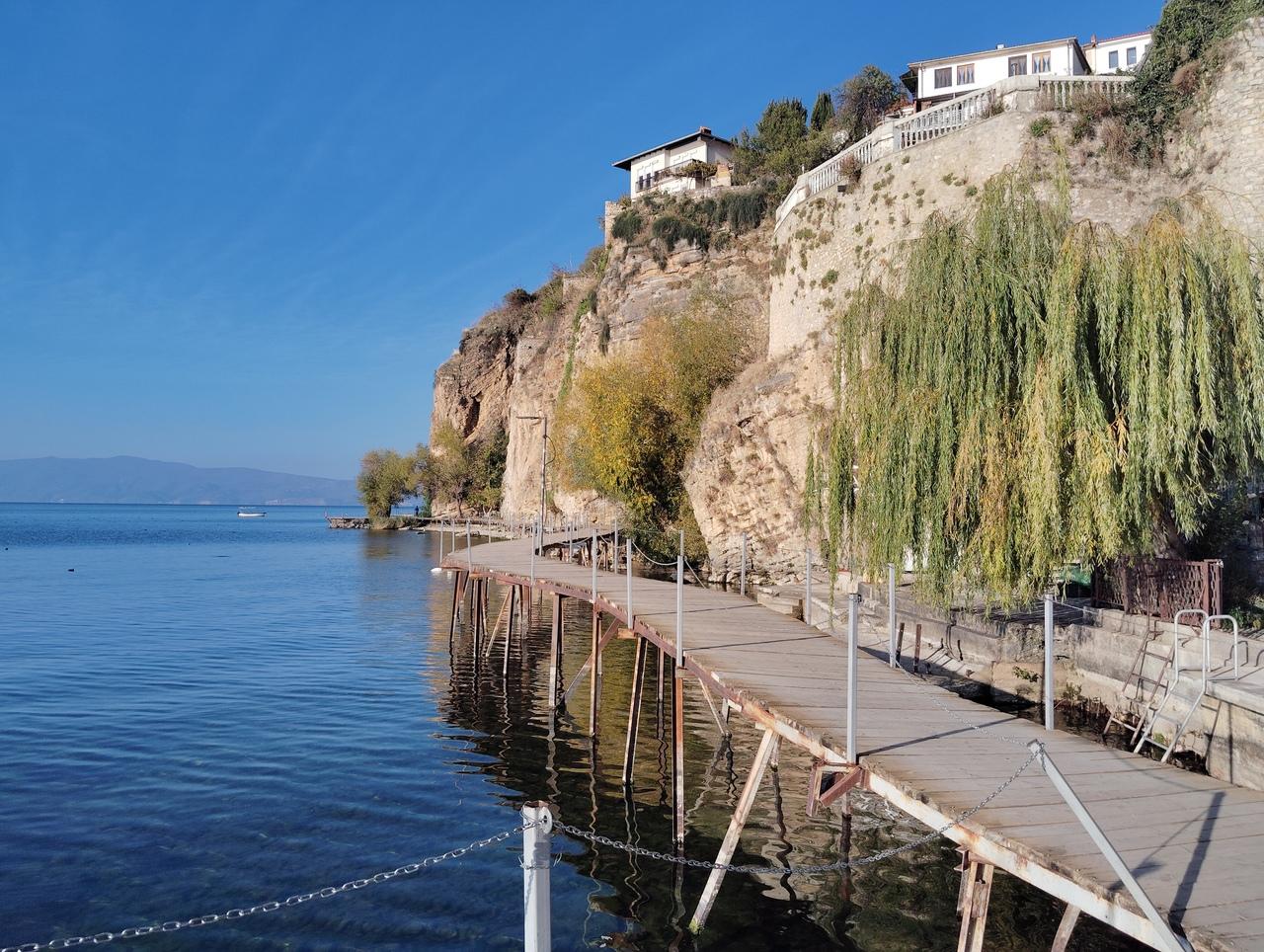 オフリド湖ほとりの木製遊歩道ボードウォーク。