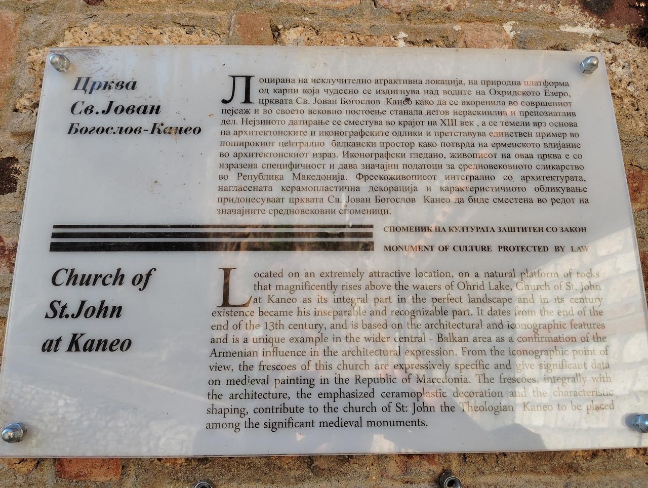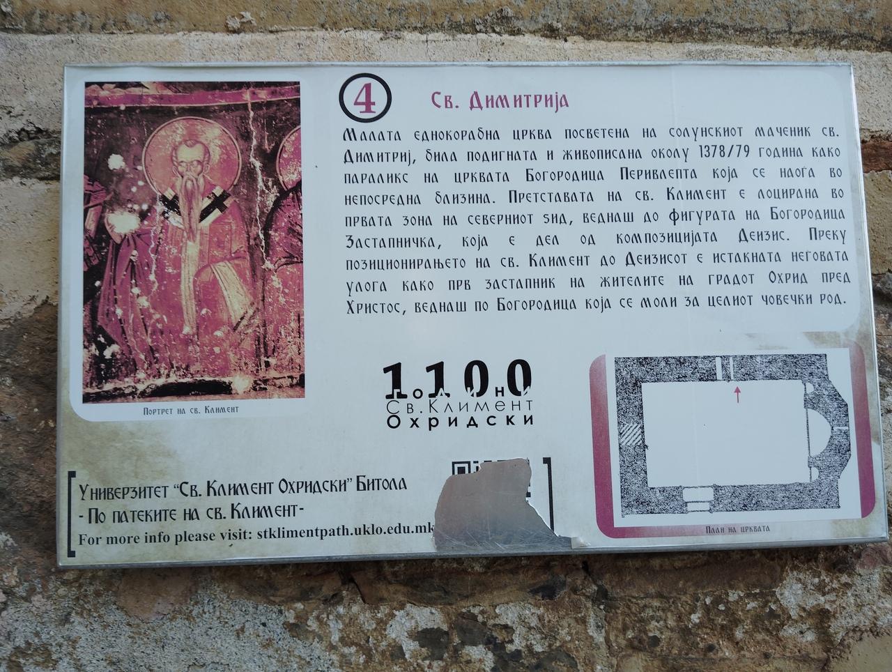聖クリメント・オフリドスキー教会: 聖ディミトリオスを描いた1378/79年頃のフレスコ画に関する説明が記載。
