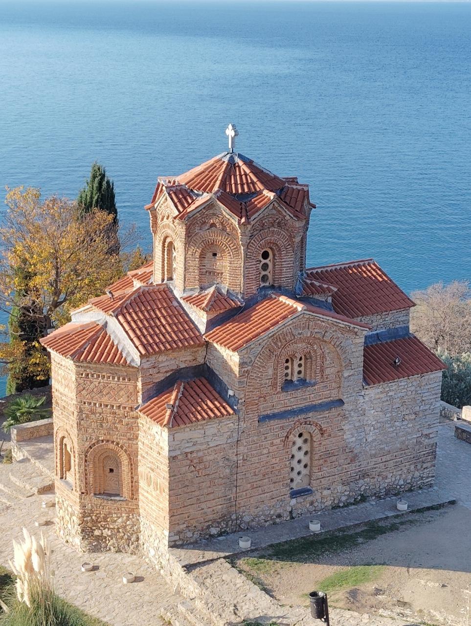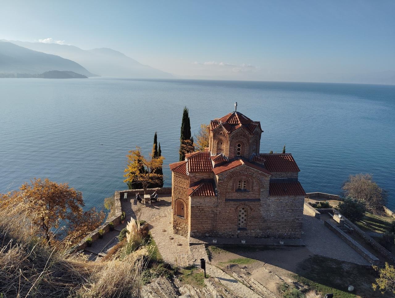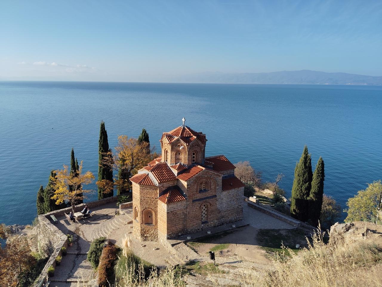 オフリド湖畔の聖ヨハネ・カネオ教会はオフリド湖に面した崖の上に立地。