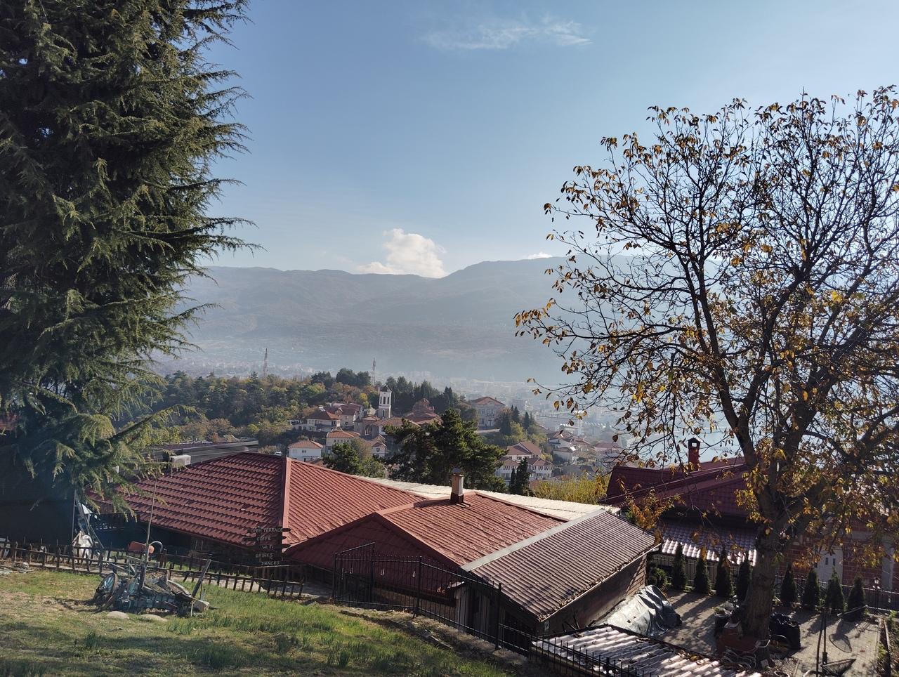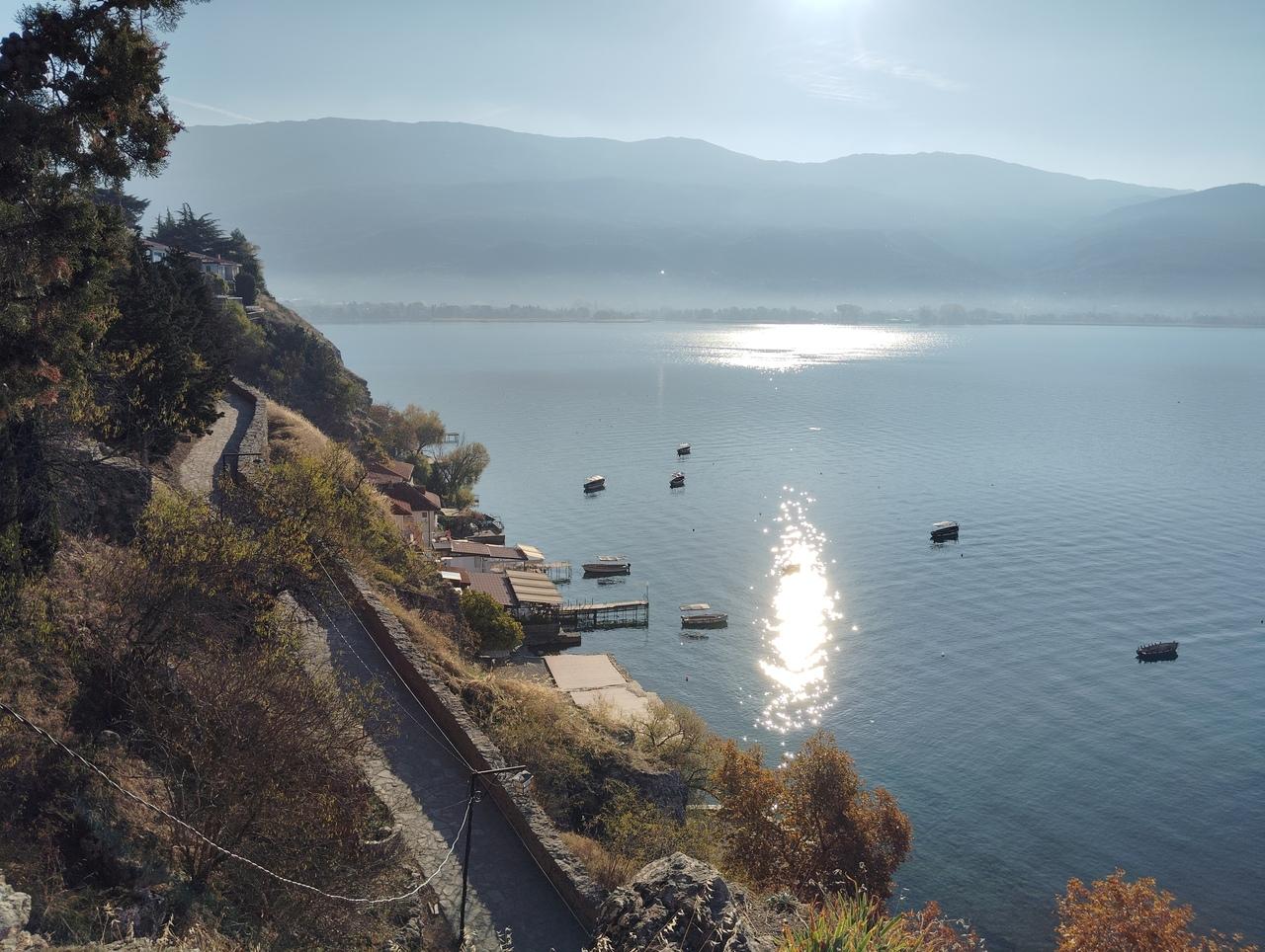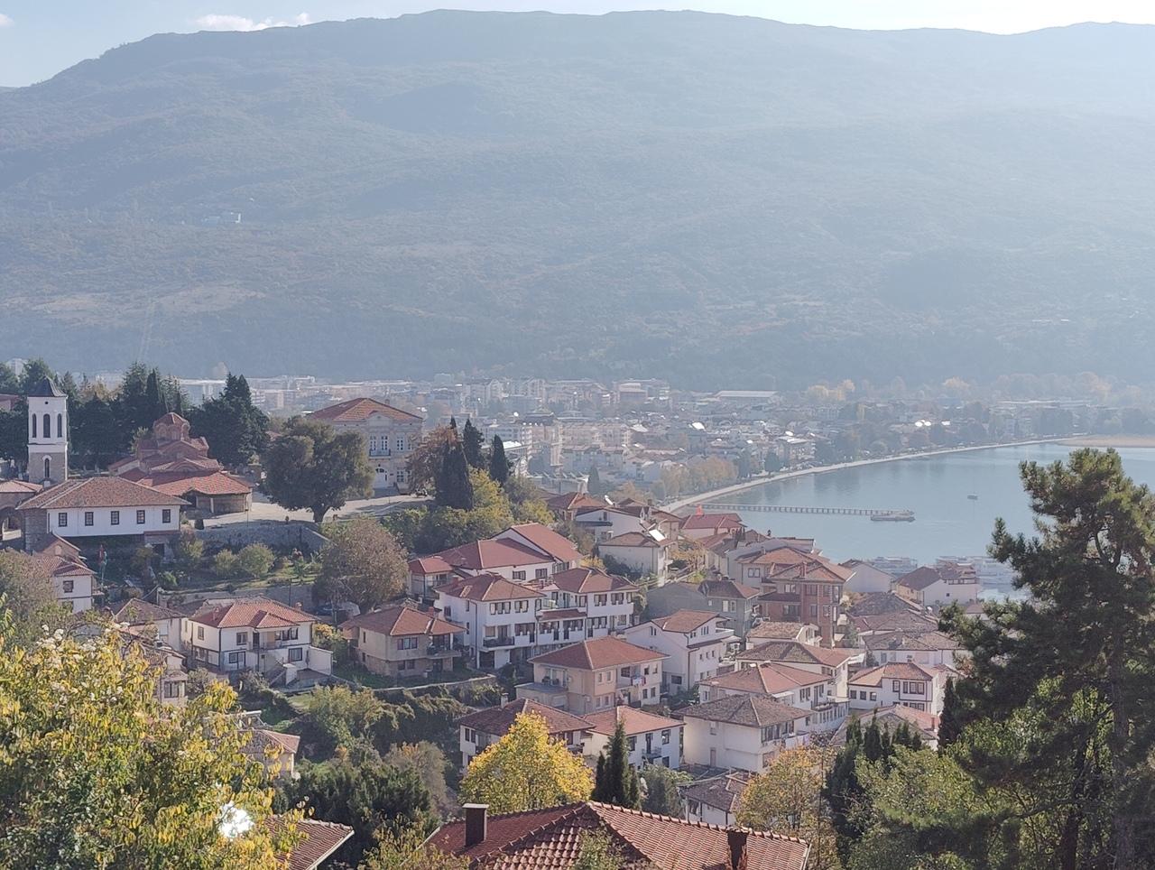 地域特有の赤屋根の家々。高台から霧がかった幻想的なオフリド湖と対岸のアルバニア国境に続く山々を一望。