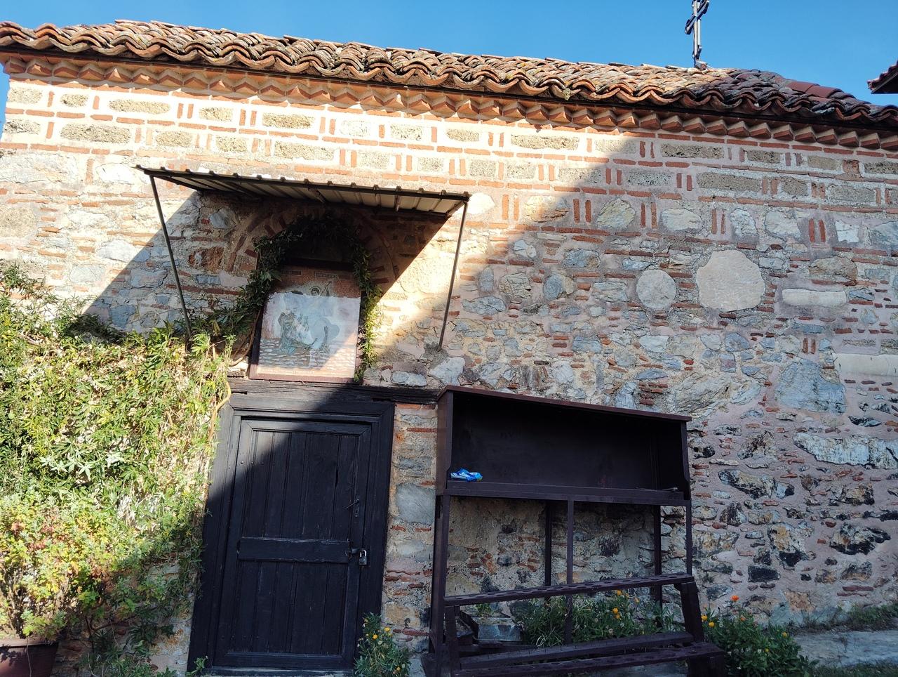 14世紀、小さな平屋建教会。入口上のひさし(キャノピー)の下に聖ニコラオスを描いたイコン(聖画)。聖ニコラオス教会 寺院・教会