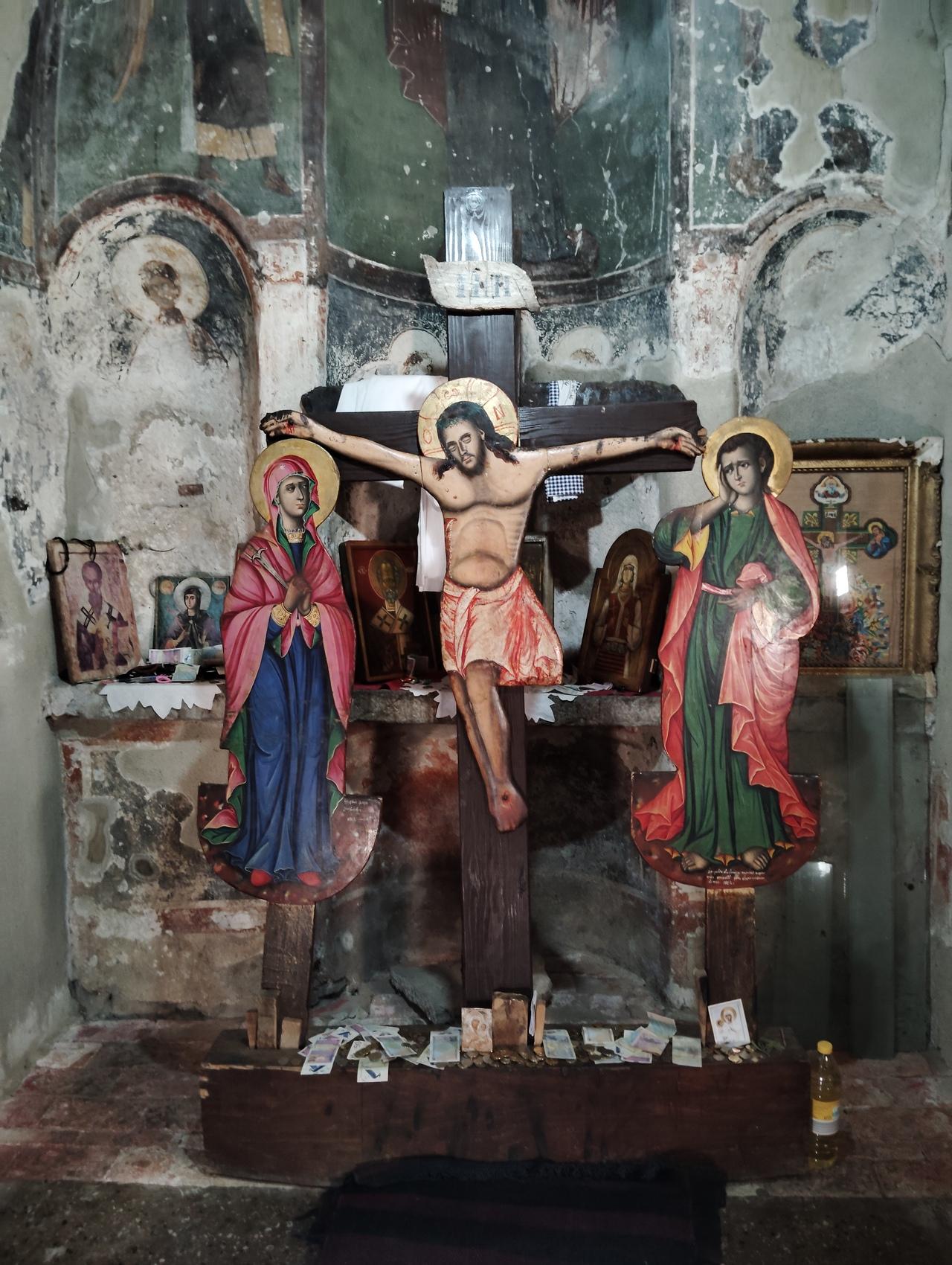 十字架のイコン: 中央にキリストの磔刑像、左に聖母マリア、右に使徒ヨハネが配置。正教会の伝統的な配置。