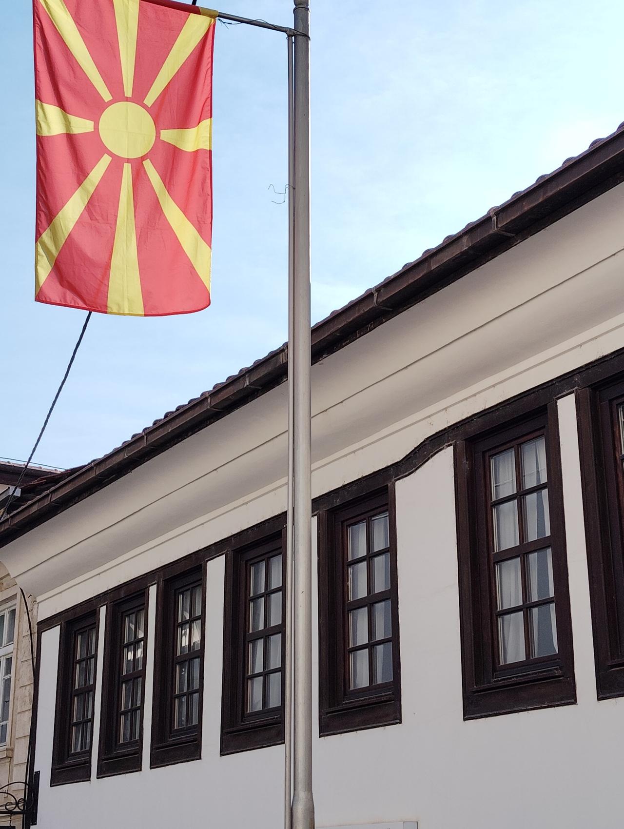 北マケドニア共和国国旗は、赤いフィールド、中心から放射状に広がる8つの幅広の光線を持つ黄色い太陽、「自由の新しい太陽」を表す。1995年に採用。