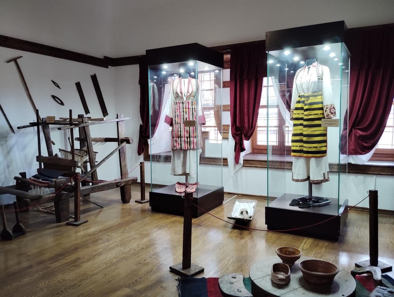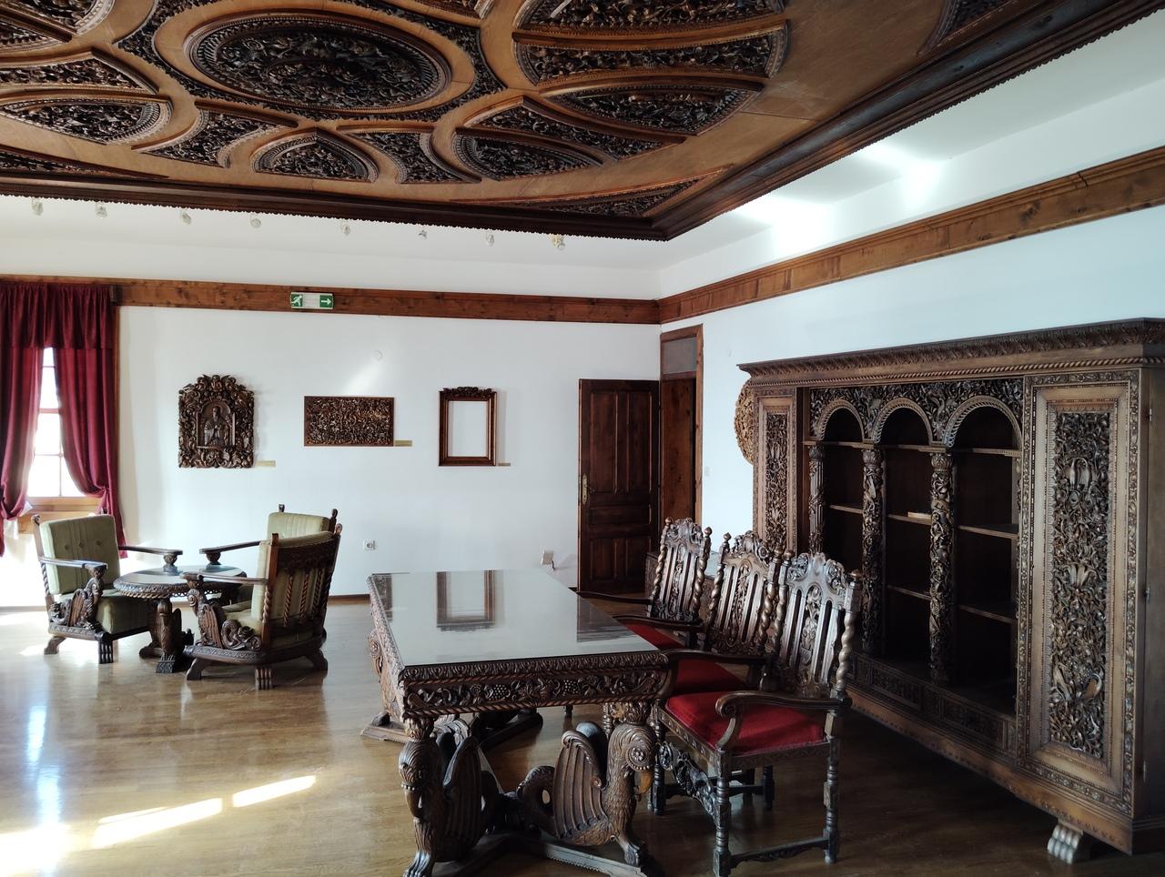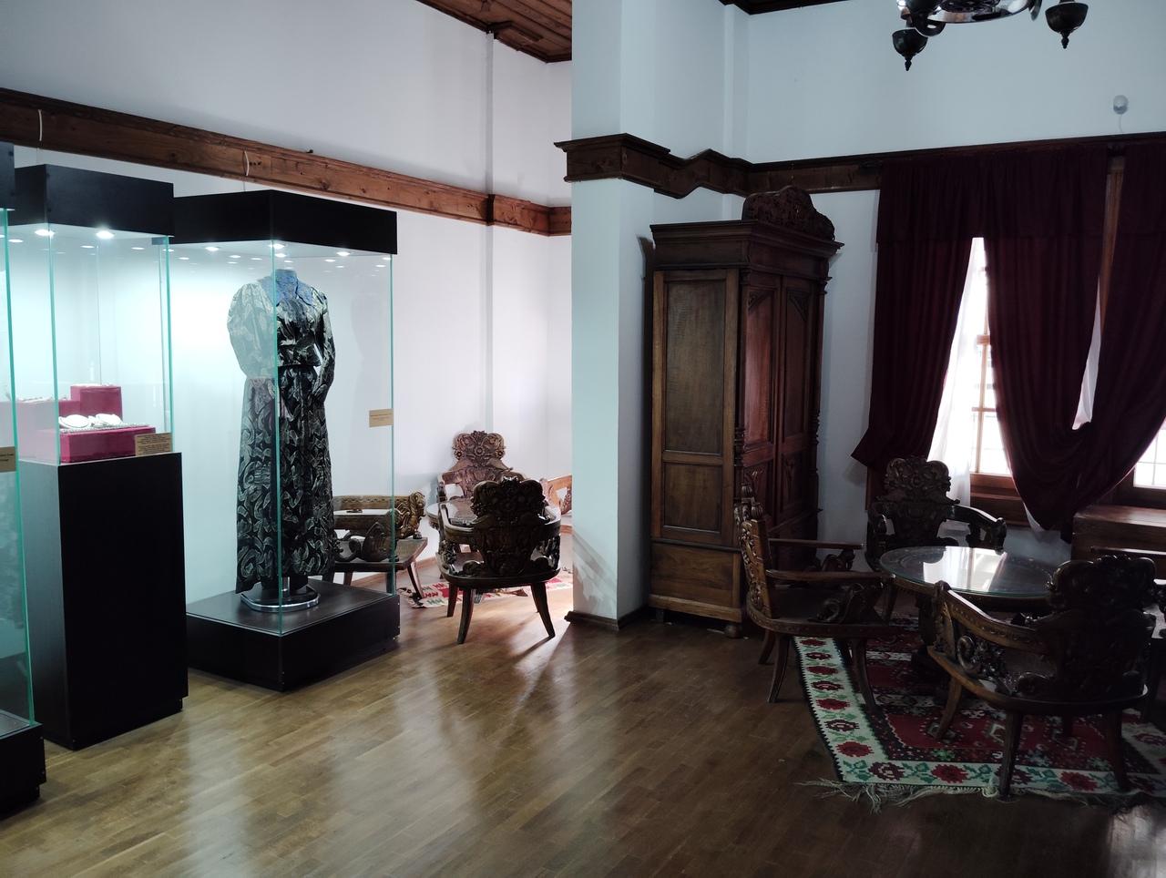 当時の伝統的民族衣装や調度品、豪華な木彫細工展示。