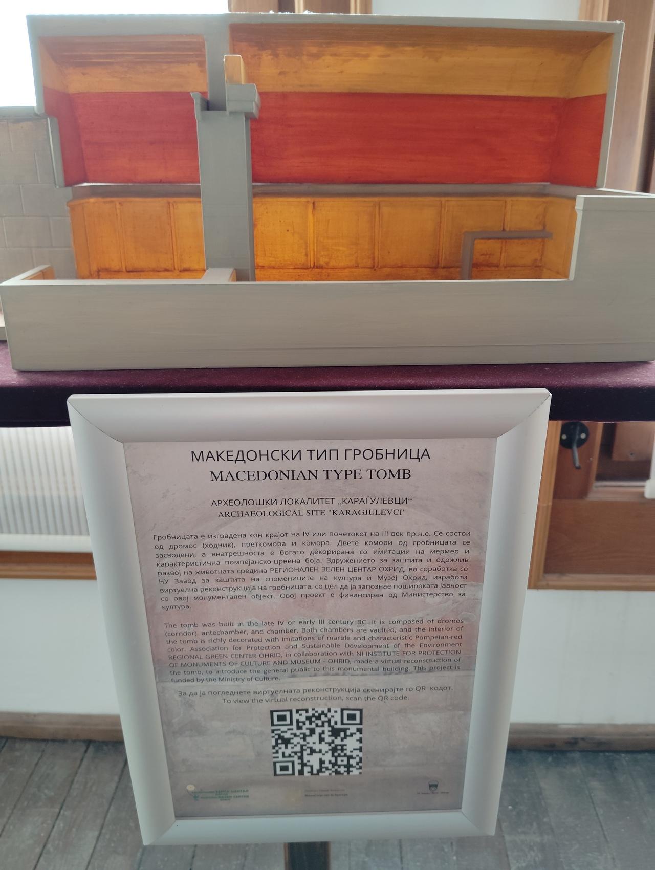 「マケドニア型墓地(MACEDONIAN TYPE TOMB)」模型と解説パネル。古代マケドニア王国の遺跡に見られる独特な埋葬形態。