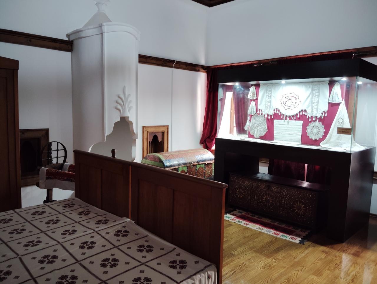 伝統的な暖炉は白石膏。 ガラスケースの中には、伝統的テキスタイルや刺繍の布地を展示。