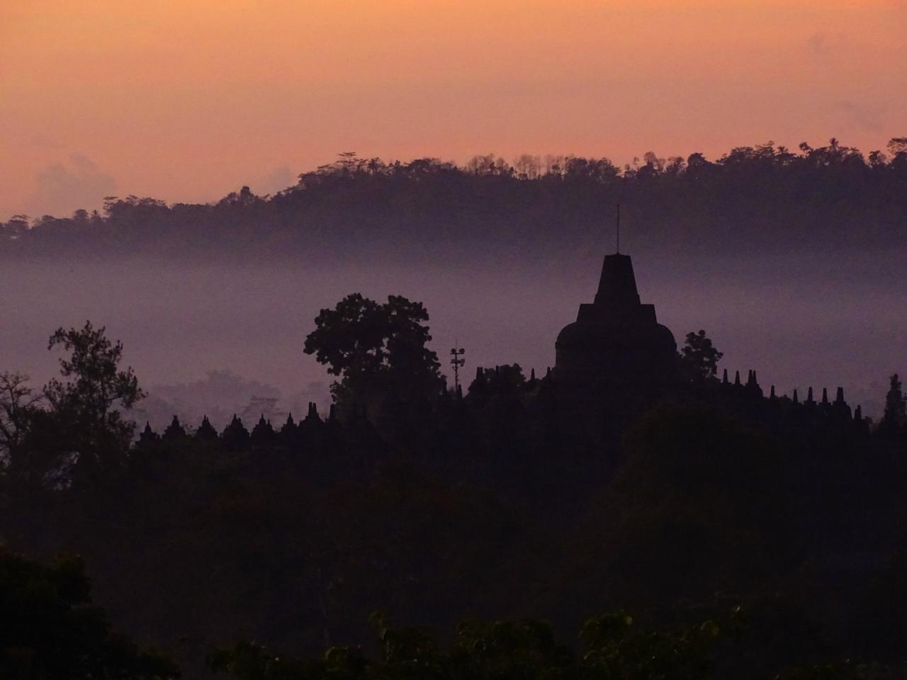 コテージのベランダから見た朝焼けのボロブドゥール寺院。