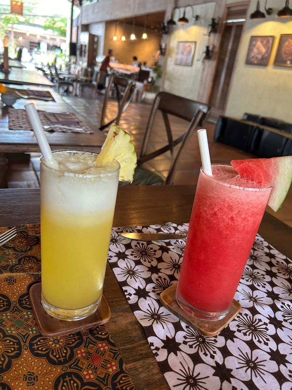 スパ開始までランチはホテルのレストランで。パイナップルジュースとスイカジュース