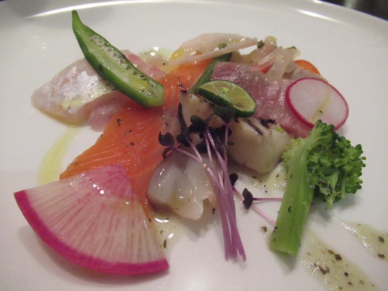 次に旬の魚介のアンティパスト。魚介は生のお刺身のようなもので、北陸はお魚が美味しいのでいい感じです