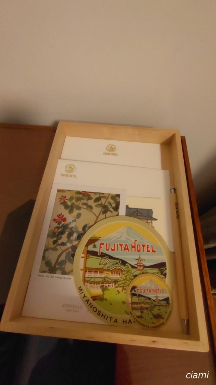 富士屋ホテルオリジナルのステッカーとハガキ。