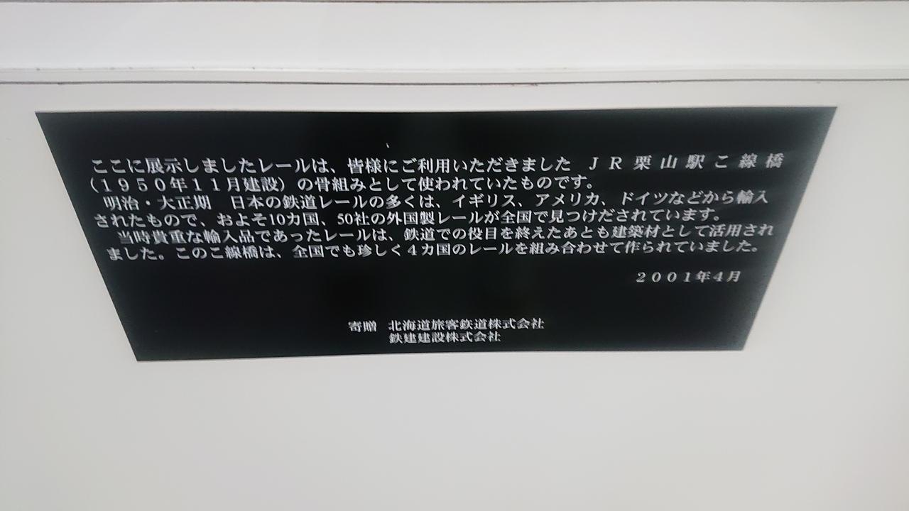 「レール」展示の説明。栗山駅跨線橋に用いられていた「レール」である、とのことでした。
