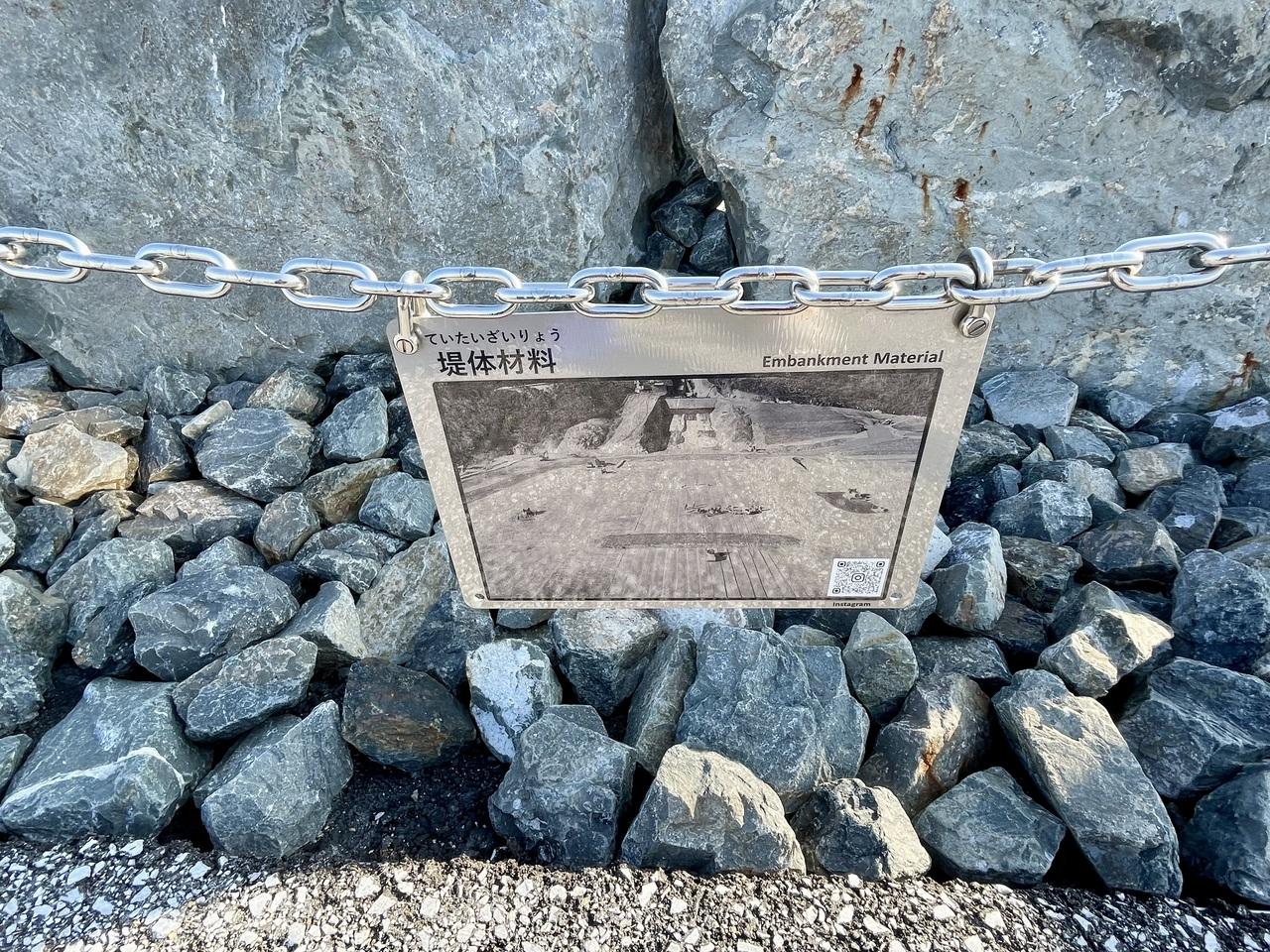 ダム堤体の一番外側を覆うように施工された巨石(ロック材)は、リップラップと呼ばれ、ダムの表面を保護する役割を持っています。