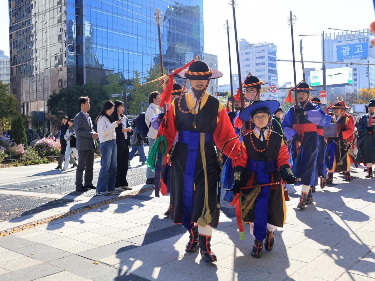 朝鮮時代の王宮で門の開閉や警備、巡回業務などを遂行した「スムングン(守門軍)」の儀式を再現した行事です。英国王室の近衛兵交代儀式に並ぶ華麗で上品な韓国伝統の宮中文化再現行事を専門家の考証を経て、1996年より再現しています。