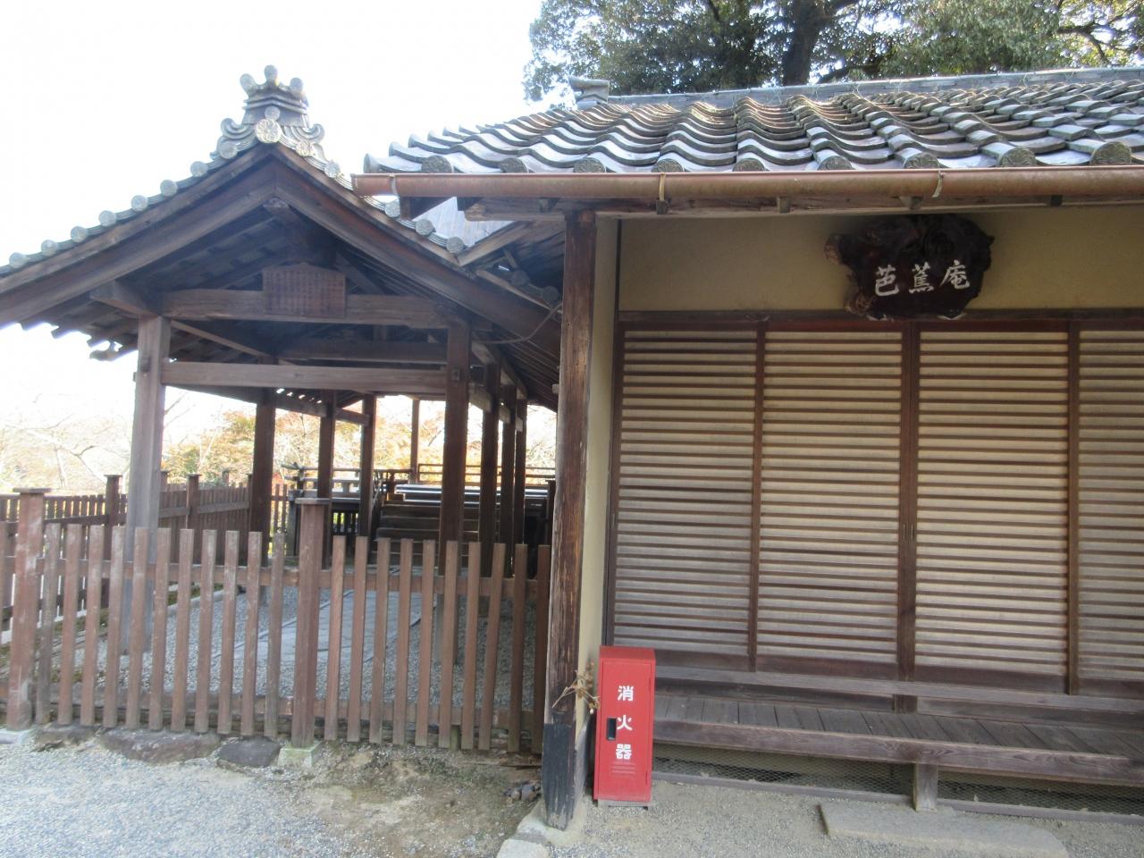 月見亭の右は芭蕉庵となっていた。左側の壁のない家が保元年間に後白河法皇が御幸をされ、月を見たという建物だ。