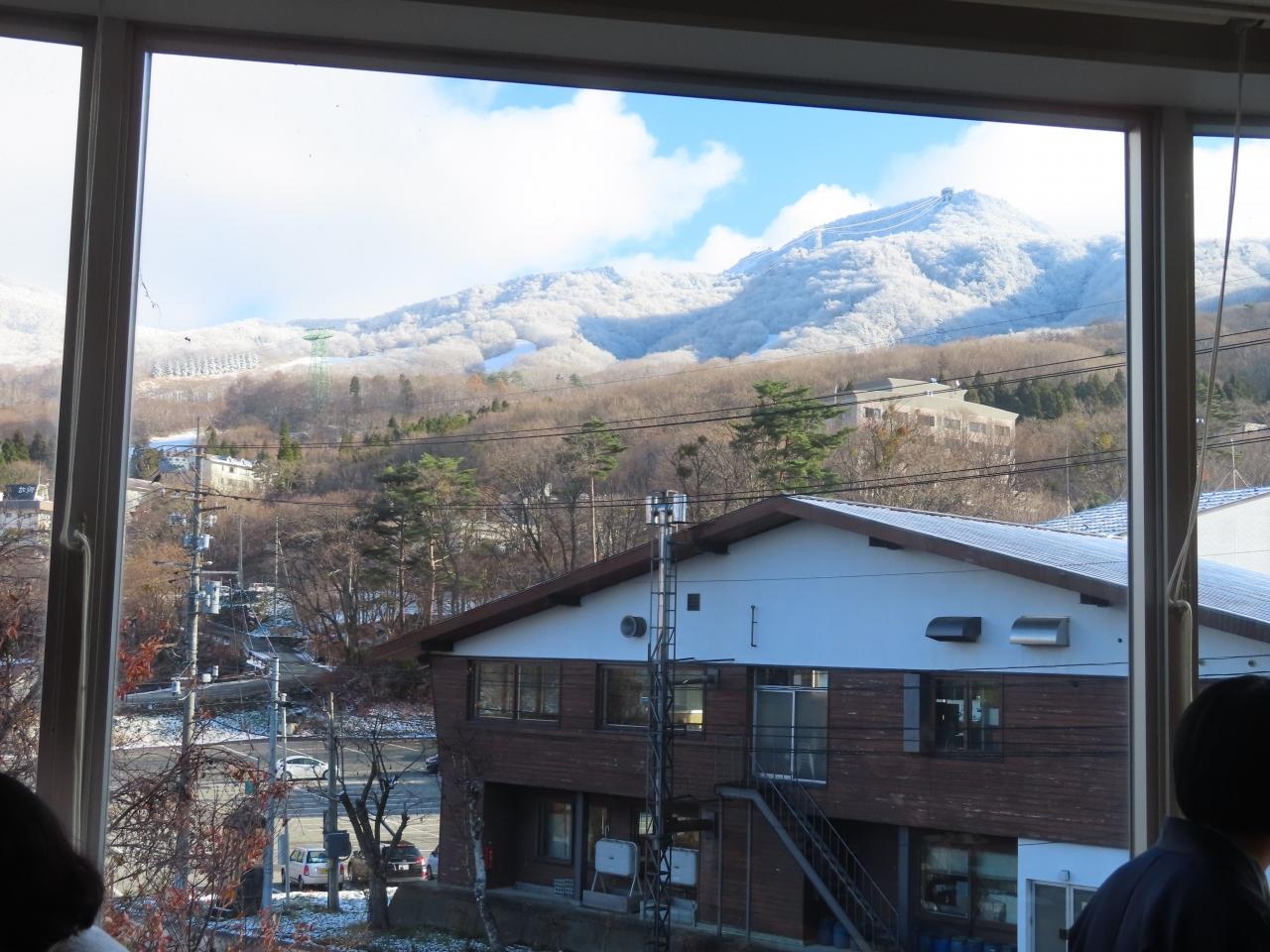 翌朝目覚めてカーテンを開けると、屋根やゲレンデにうっすらと雪が積もっていて、初冬の趣き。