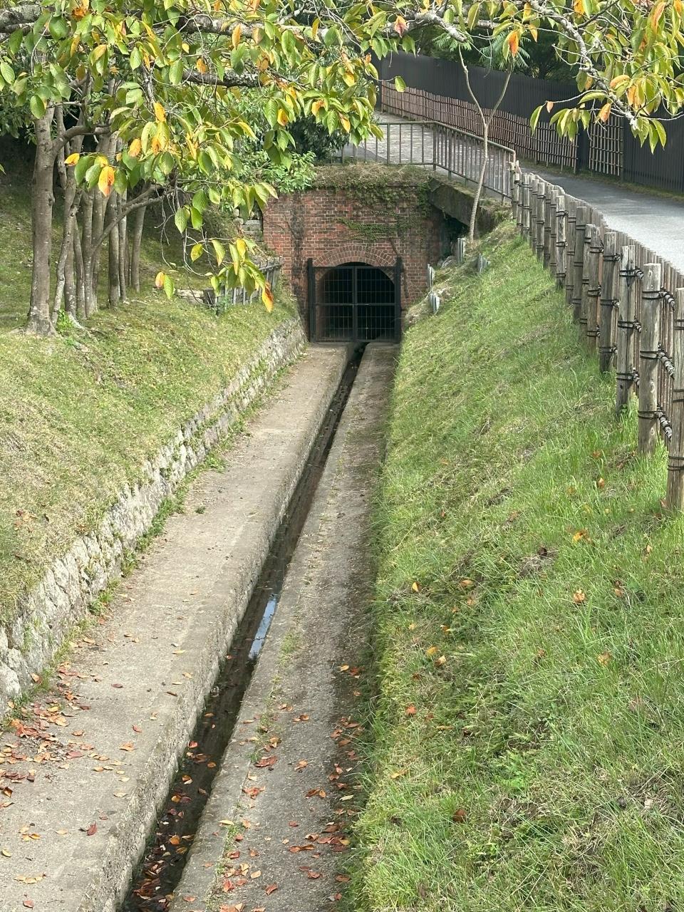 さらに中に入ると、写真の荒池放水トンネルがある。奈良では珍しい煉瓦造の水路トンネル。建設年は不明だが奈良ホテル建設時の明治40年代に設けられた可能性が高いと思われる。現在は荒池の洪水調節機能を付与されている。