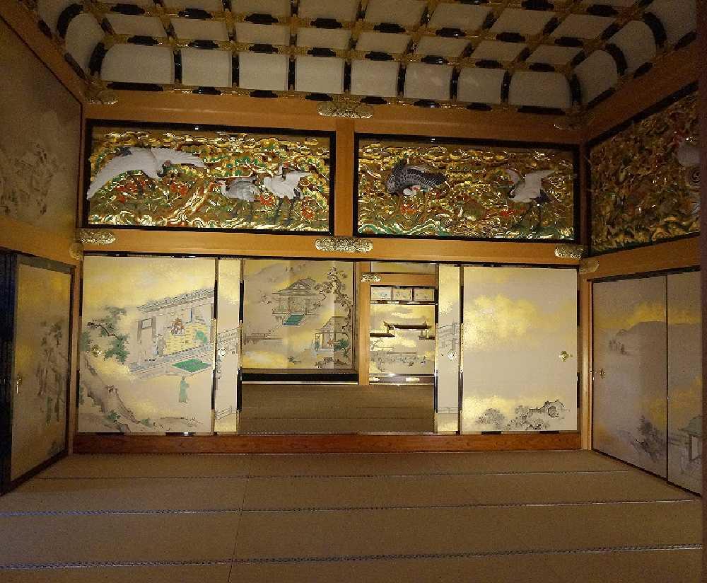 上洛殿(その2)。座敷内の障壁画は、江戸時代の著名な絵師・狩野探幽によるものの復元。