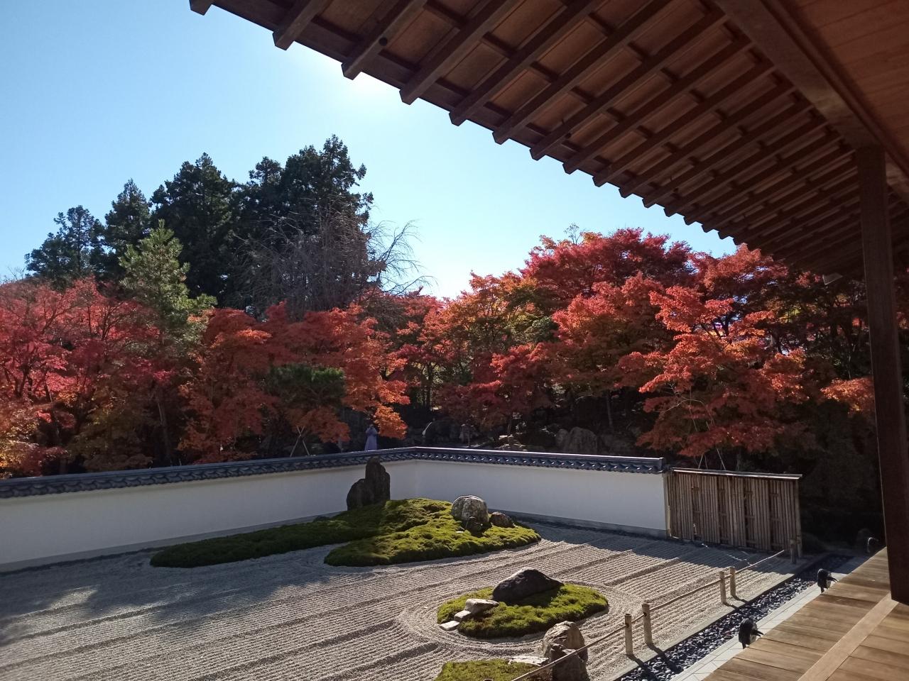 なるほど、この窓から先ほどの石庭を見るわけですね。これも絵葉書きにもなるような異次元の美しい光景です!美し過ぎる庭園のバックに真っ赤な艶やかな紅葉は抜群の景観です!