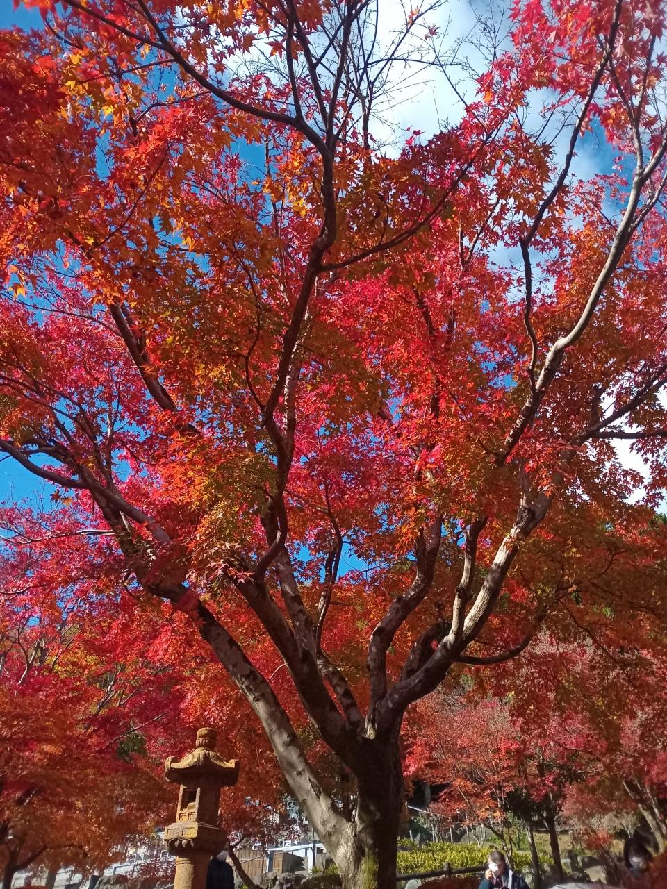 この絶好の青空で日の当たりが最高!絶句するほど艶やかで美しい紅葉です!まだ境内に入る前の時点でも超感動します!