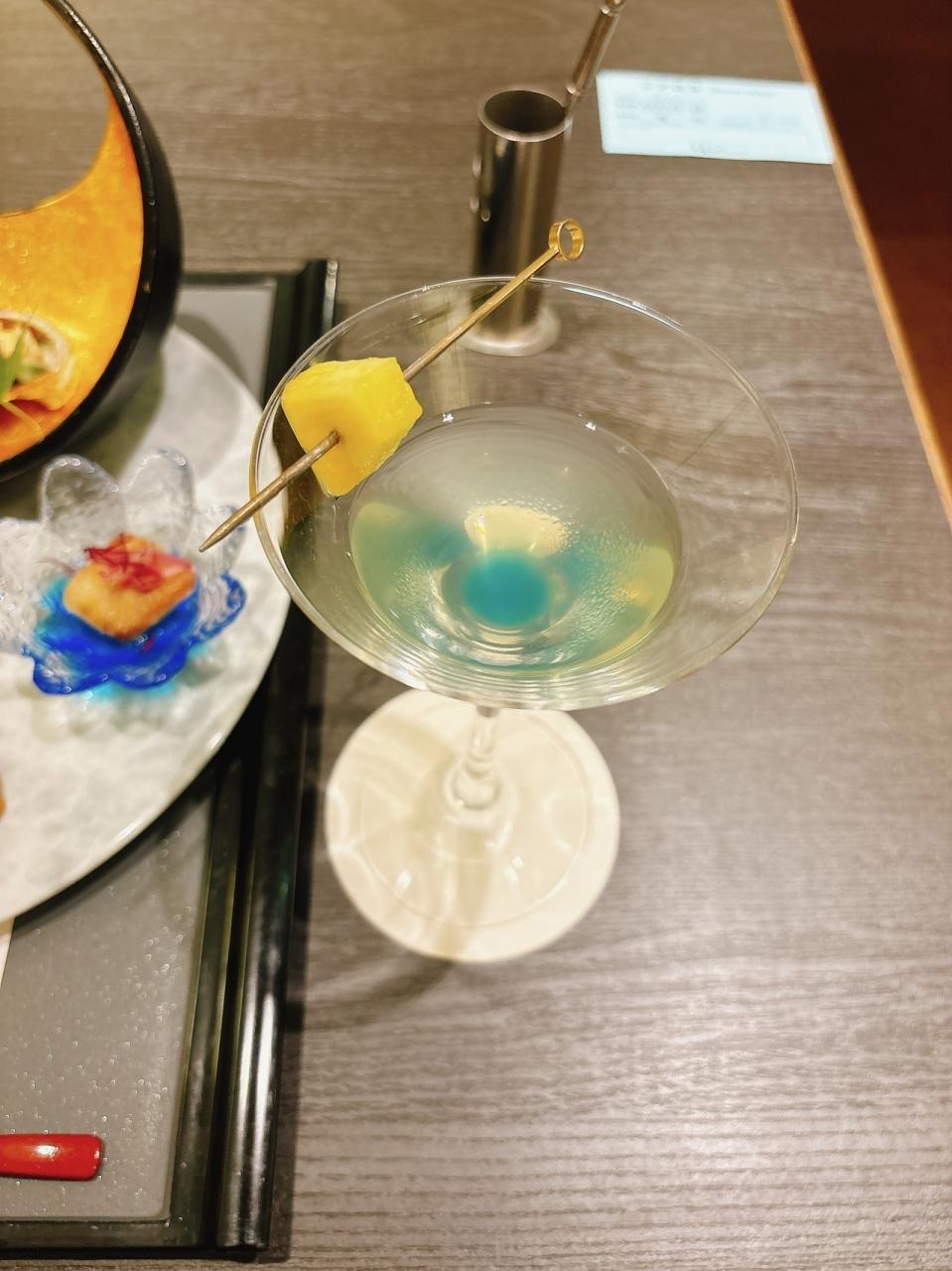 きれいなブルーのカクテル。夏の豊平峡ダムをターコイズブルーで表現したとメニューにありました。【食前酒】 夏のオリジナルカクテル「碧い夏~AOI,NATSU~」~カットパインを添えて~