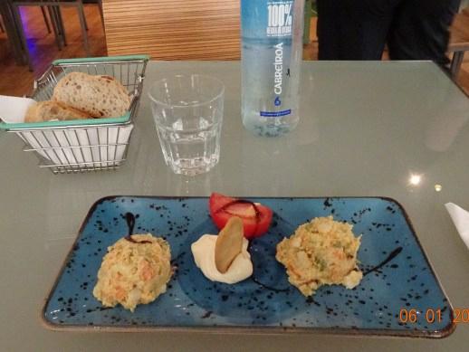 ポテトサラダが好物なので、名前は違ってもスペインではルシアン・サラダという名前でメジャーになってます。前菜にそれをお願いしたけど、出てきたのを見たら想像と違ってオシャレだけど量が少ないよ。色も白じゃなくて不味そうな色になってます。まぁルシアン・サラダも色々あるってことなんでしょう。中央にある白いのは何かと思ったらマヨネーズでした。最初はそうとは知らずにサラダを食べ出してしまった。 -