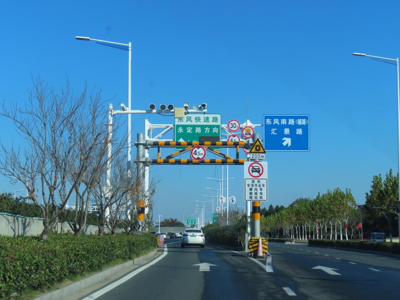 さて初めての週末、泰州老街と言う泰州市きっての観光地に出かけてみました。東風快速路という高速道路に乗ります。入り口にカメラが5台も付いてます。