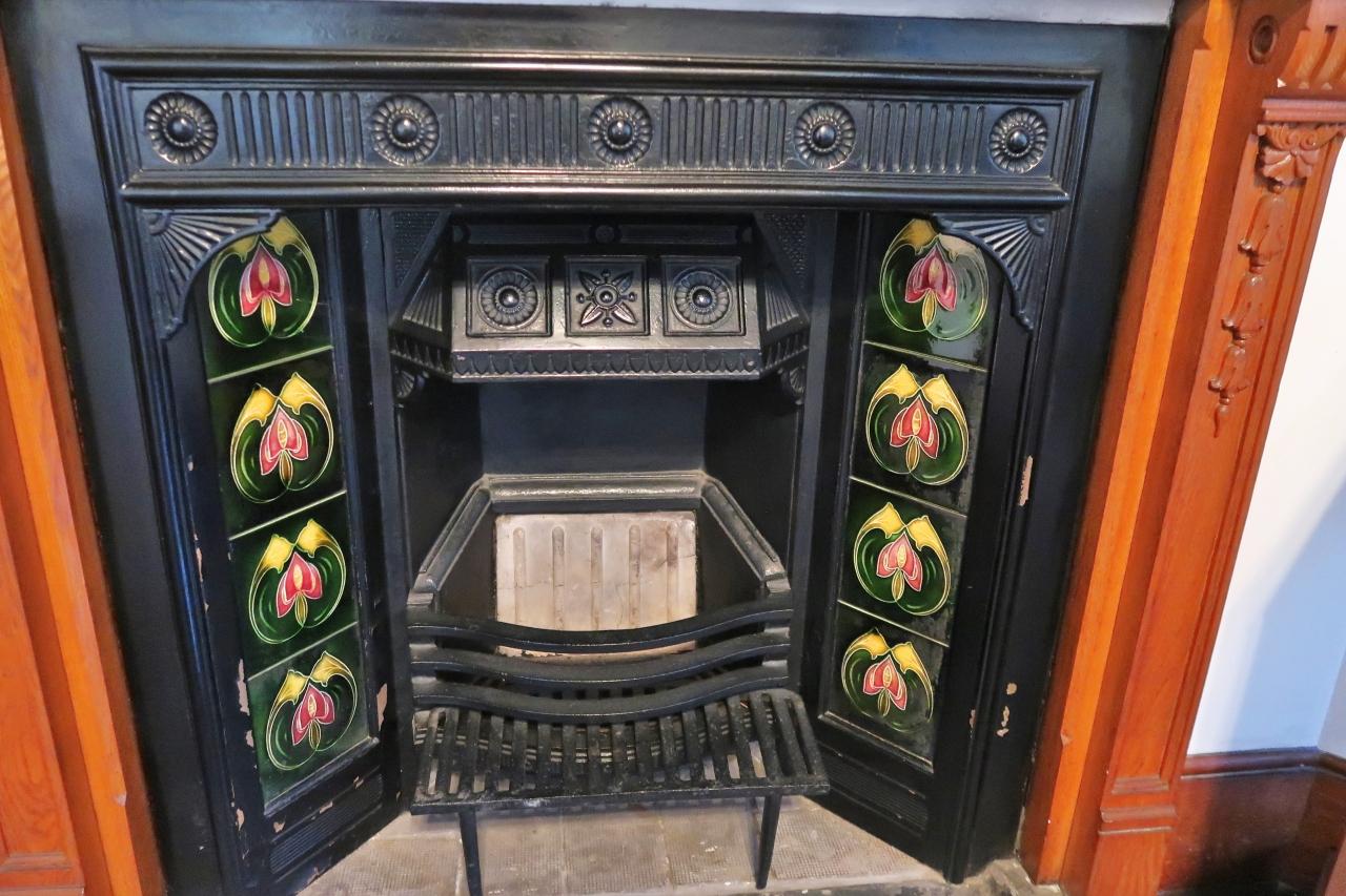 居間の暖炉は、アール・ヌーヴォー調のタイルで装飾されています。