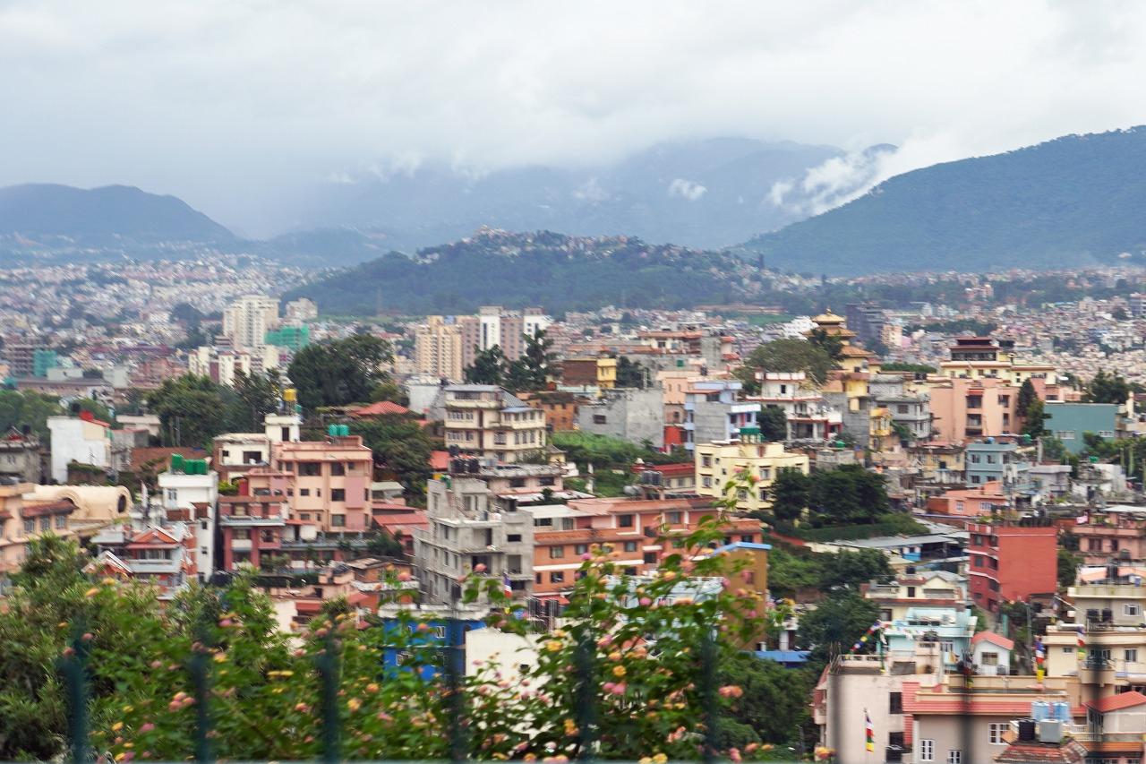 高度が上がるにつれてカトマンズ盆地の景色が見渡せ、町並みの向こうには山々が連ねっています。