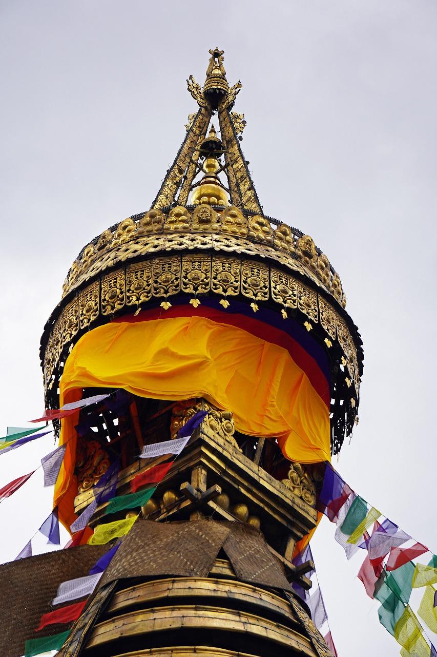 寺院中央には下部が白いドーム状で上部にブッダアイを四方にもつ高さ15メートルの黄金の仏塔がそびえ、四方八方へ5色の鮮やかなタルチョが伸び、カトマンズを象徴する景観を作っています。大きさでは市内で通過したボウダナートの仏塔よりもはるかに小さいのですが、ネパール仏教にとっては最も重要な仏塔とされます。