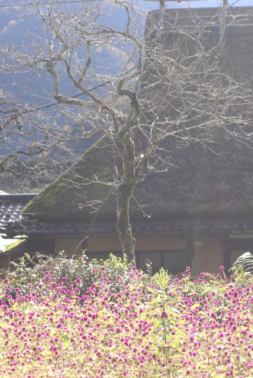 かやぶき屋根と千日紅